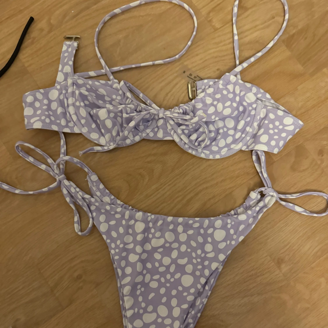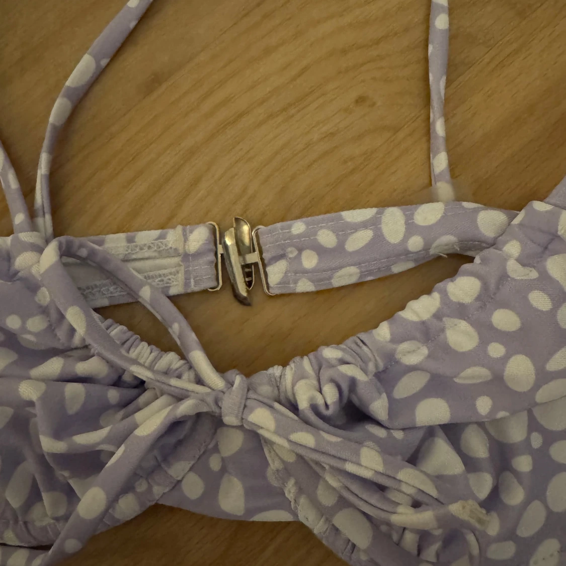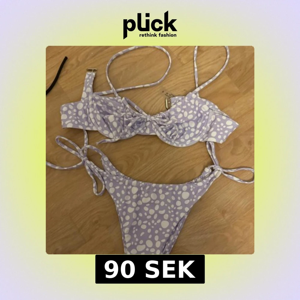 Säljer en ljuslila bikini med vita prickar. Överdelen har rosett framtill, justerbara axelband och metallspänne i ryggen. Underdelen har knyt i sidorna. Perfekt för stranden!