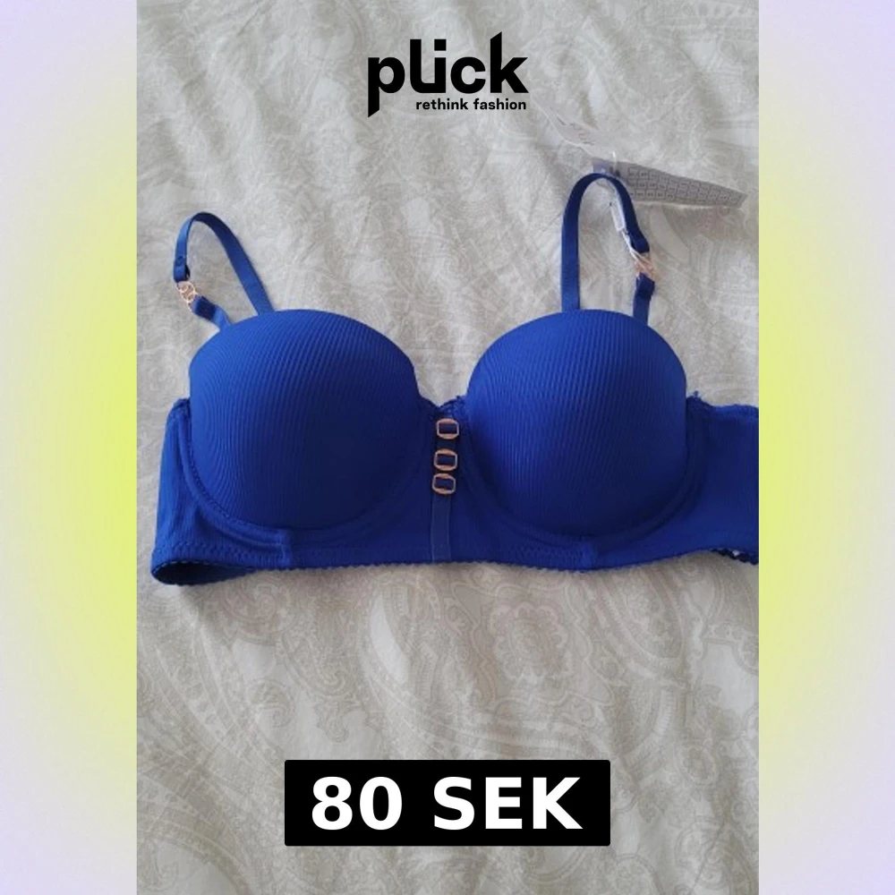 Snygg blå behå från Dandissi med lätt vadderade kupor och justerbara axelband. Framsidan har tre dekorativa metallspännen i guld och tyget är ribbat för extra stil. Perfekt för dig som vill ha en modern och bekväm look