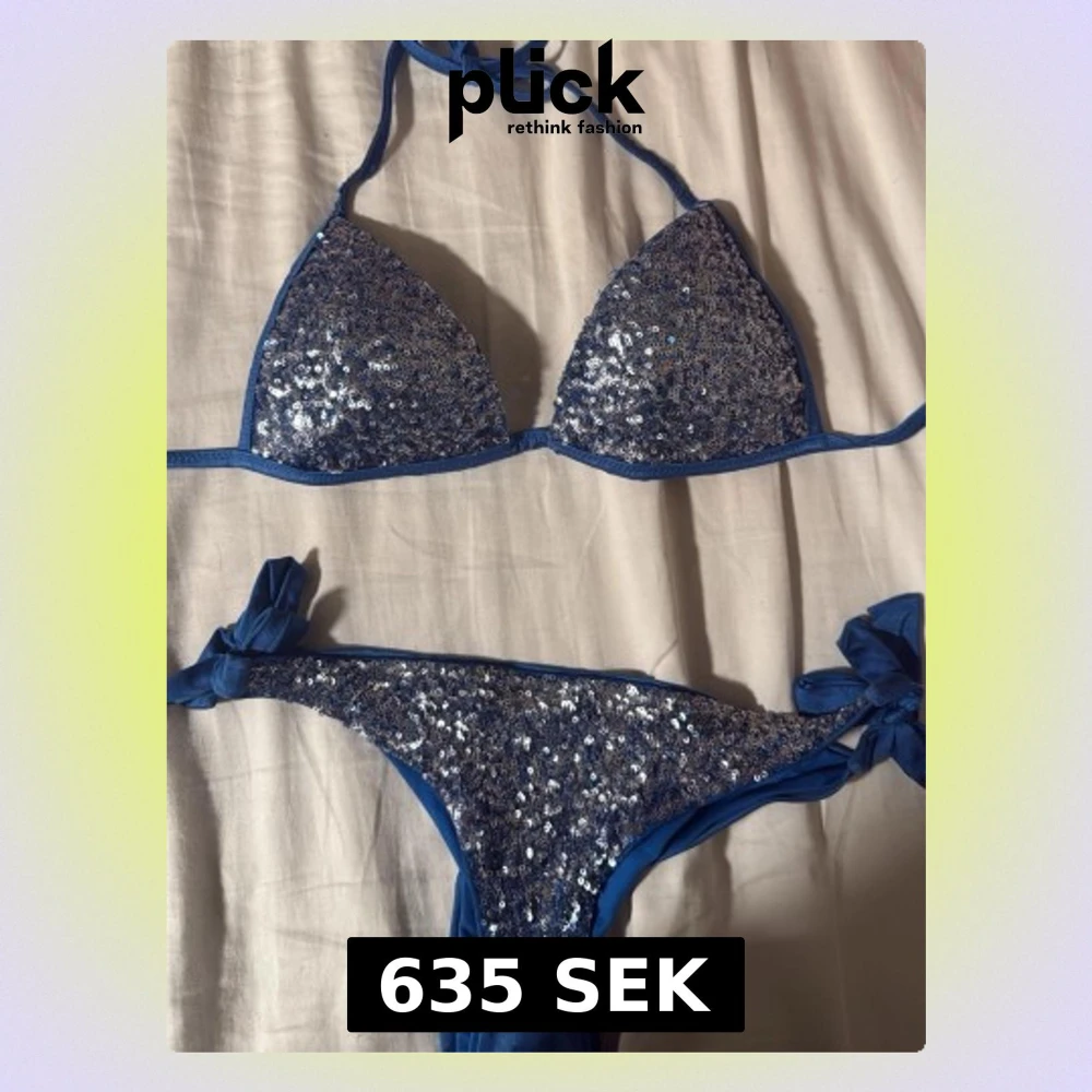 Säljer en blå bikini med silvriga paljetter på både överdel och underdel från calzedonia. Bikinin har trekantsmodell på toppen och knytband både i nacken och på sidorna av trosan. Perfekt för dig som vill sticka ut på stranden med extra bling. Se sista bild så ser du att banden blivit lite uttöjda. Slutsåld ÖVERALLT