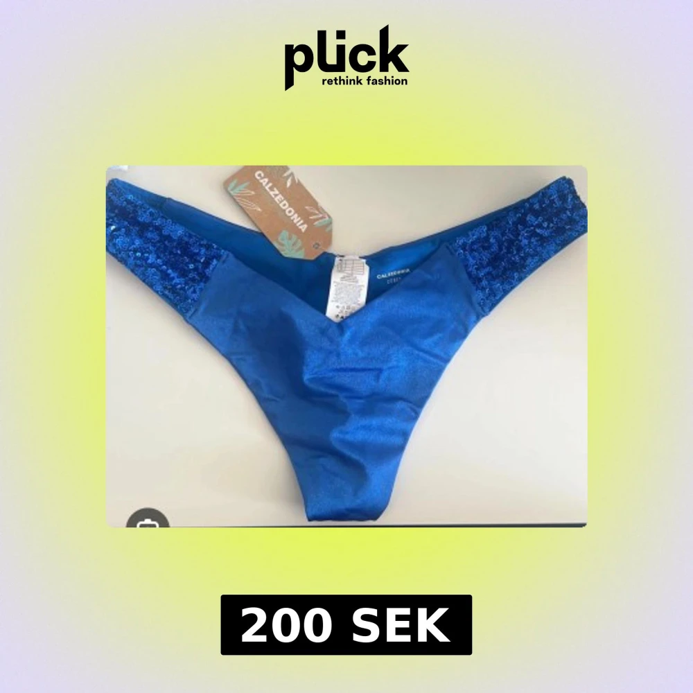 Snygg blå bikiniunderdel från Calzedonia med glittriga paljettdetaljer på sidorna. Modellen har en V-formad skärning framtill och är tillverkad i ett syntetmaterial som ger en glansig finish. Perfekt för strandhäng och poolparty!