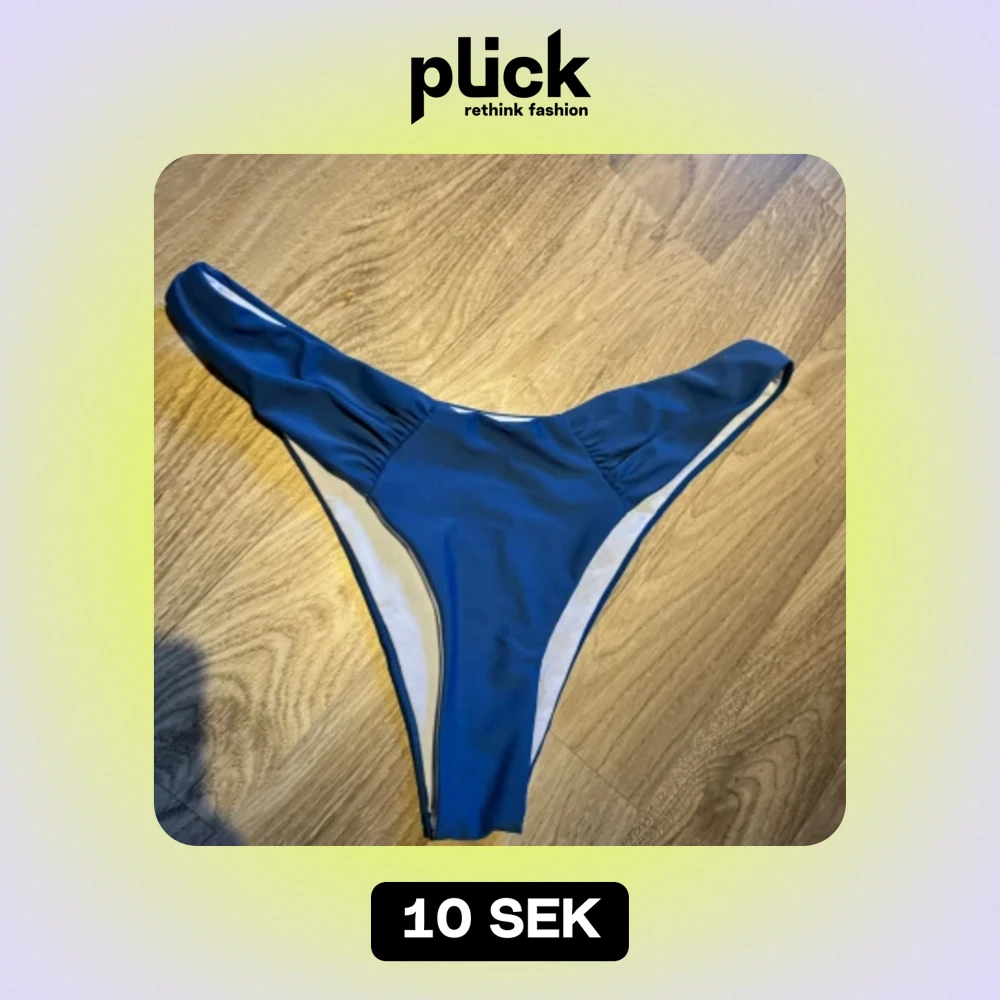 En blå bikiniunderdel. Underdelen har en enkel och stilren design med rynkade detaljer på sidorna. Endast provad utanpå byxor. Små i storlek.