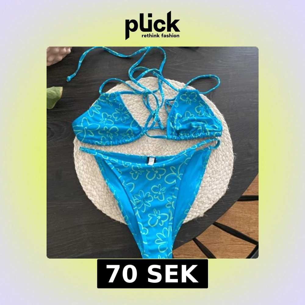 Supersnygg blå bikini från NA-KD med grönt blommigt mönster. Överdelen har trekantsform och smala snören som kan knytas på olika sätt i storlek XS. Underdelen är lågmidjad med smala sidoband i storlek S. Aldrig använd!!