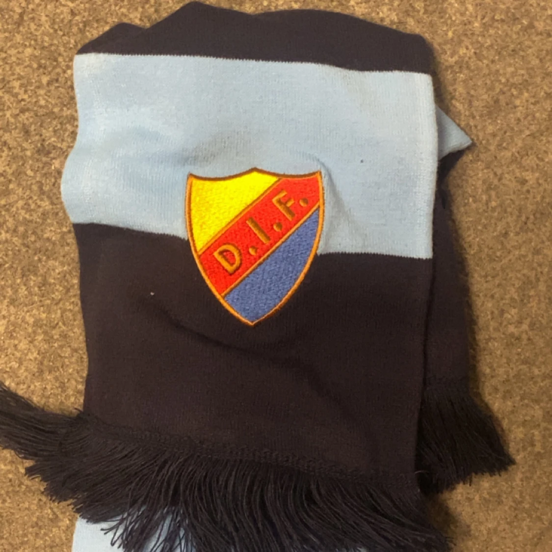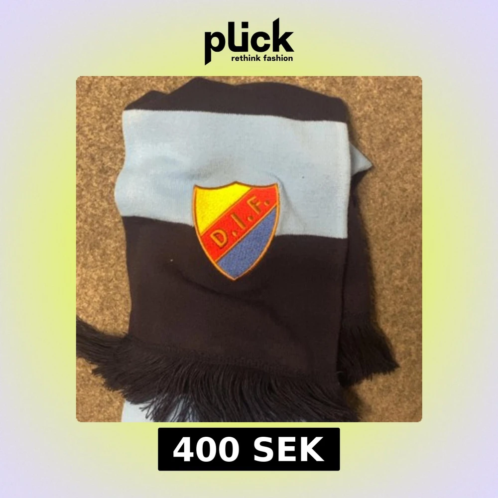 Säljer en snygg halsduk från Djurgårdens IF med broderat klubbmärke. Halsduken har breda marinblå och ljusblå ränder samt svarta fransar i ändarna. Perfekt för att visa ditt stöd på matchen eller hänga med polarna.