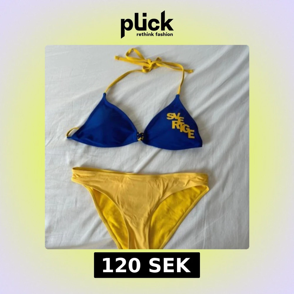Snygg bikini i Sveriges färger med blå trekantsöverdel och gula knytband. Toppen har texten 'Sverige' i gult och ett flätat blå-gult band mellan kuporna. Matchande gula bikinitrosor. Perfekt för stranden eller poolen! ÖVERDELEN ÄR I STORLEK 36 från Wrap OCH UNDERDELEN ÄR I STORLEK 38 från H&M