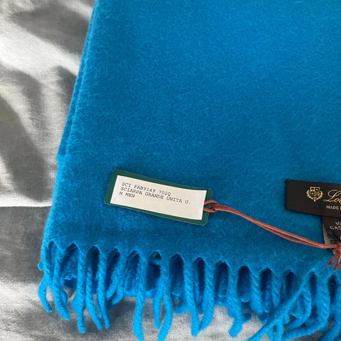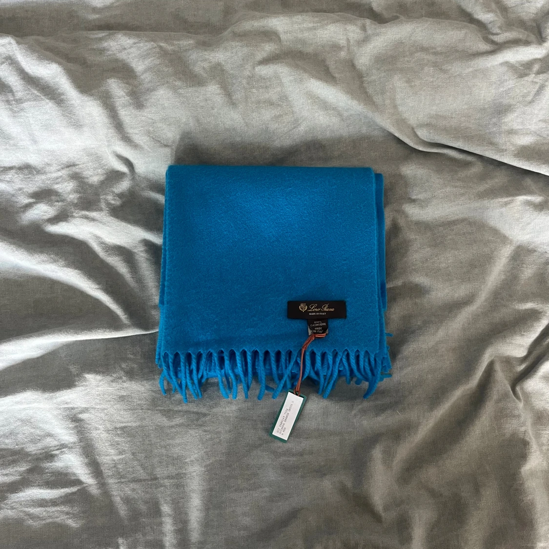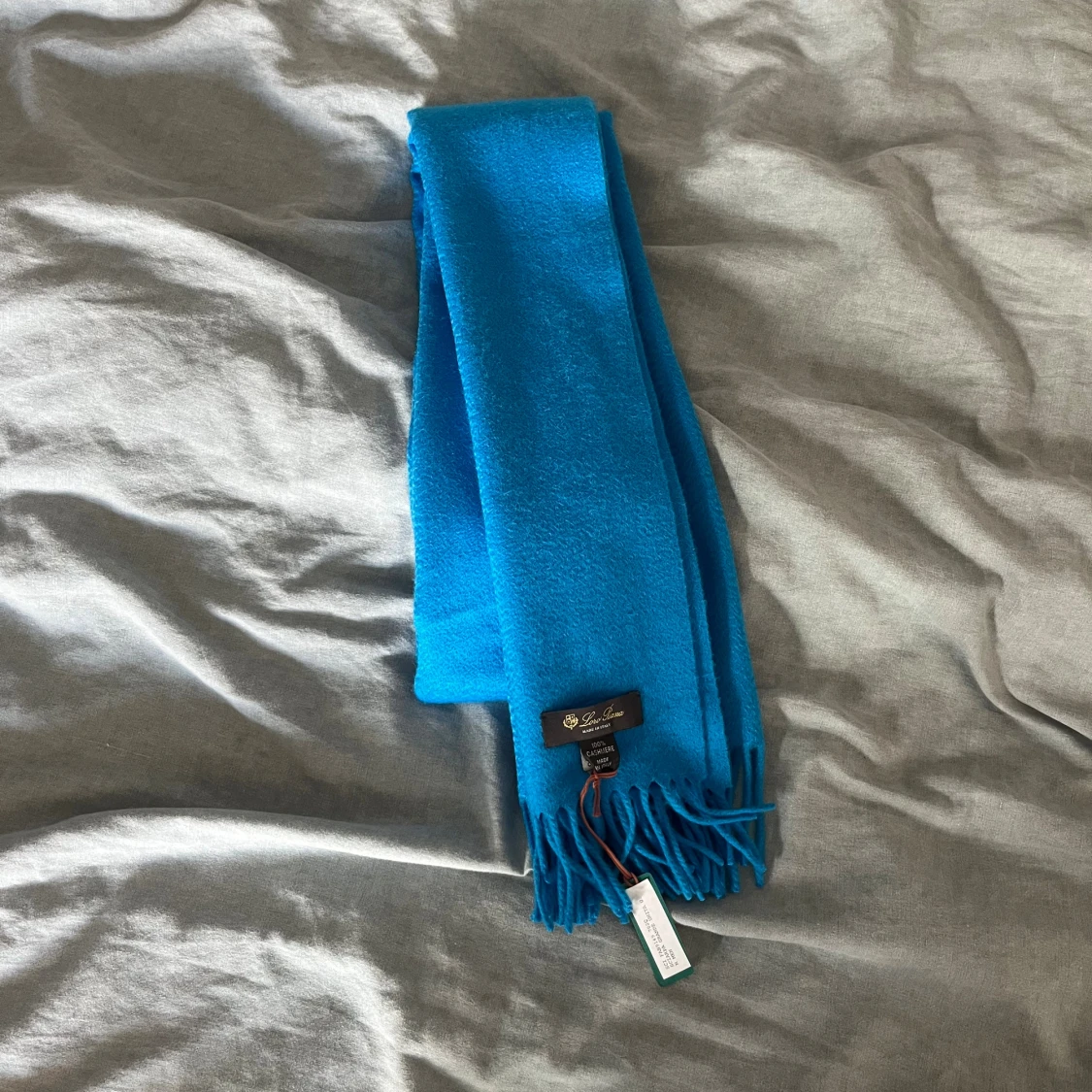 Supersnygg blå halsduk från Loro Piana i 100% kashmir. Den är mjuk, har klassiska fransar i kanterna och en stilren design utan mönster. Perfekt accessoar för att lyfta din outfit med en pop av färg och lyxig känsla. Helt ny med tags