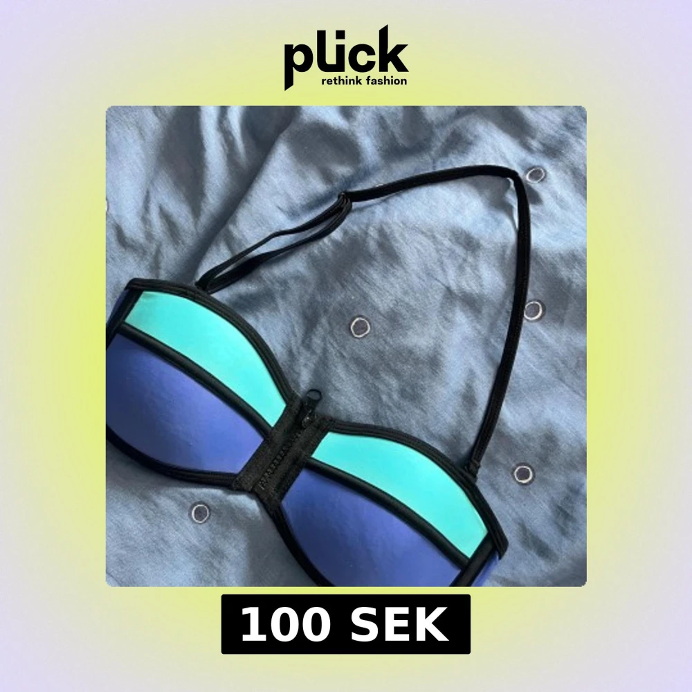 Snygg bandeau bikiniöverdel i blått och turkost med svarta kanter, en dragkedja framtill och avtagbara axelband. Vet inte riktigt märket då den är köpt utomlands. Passar mig med storlek 75B