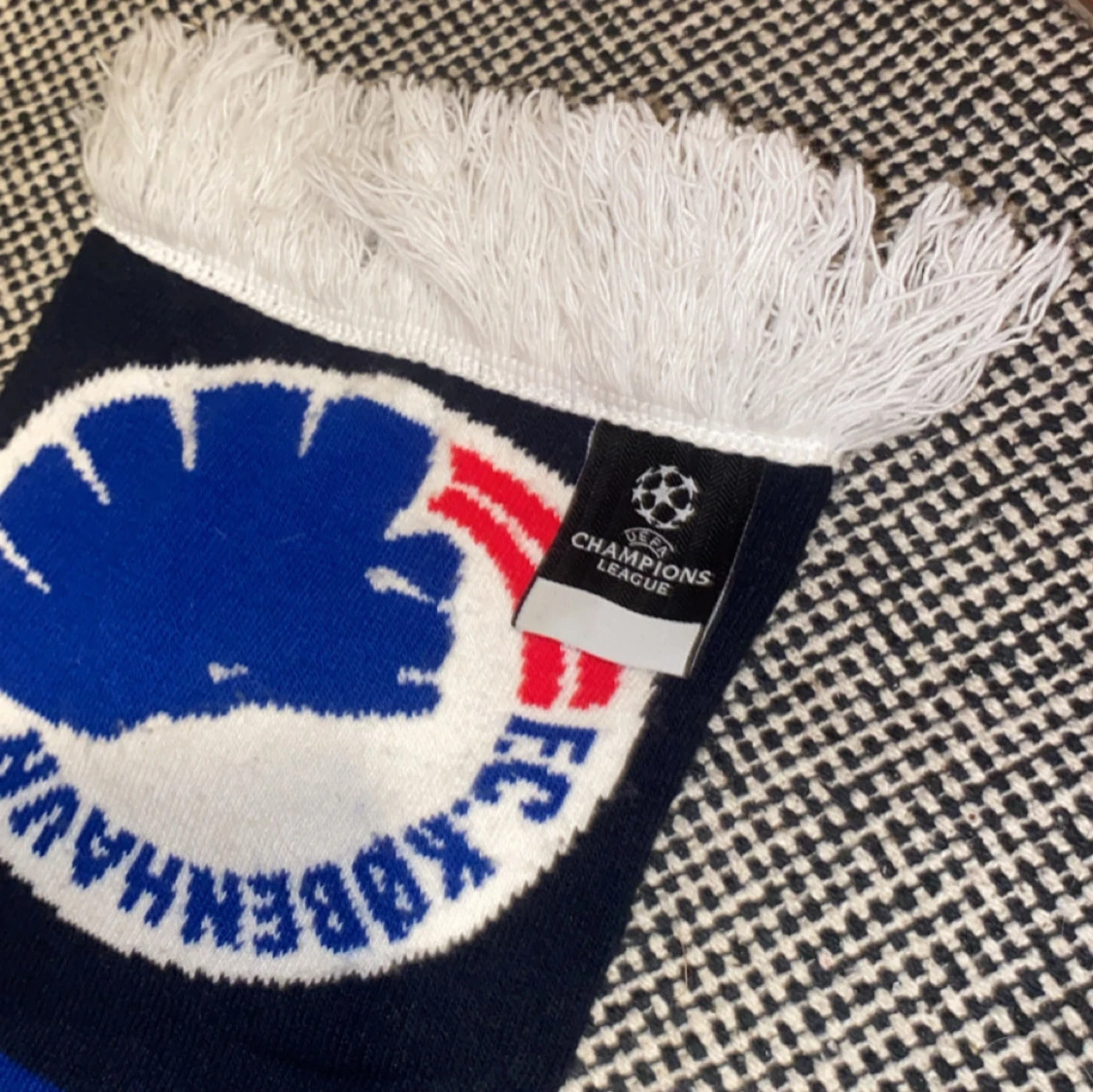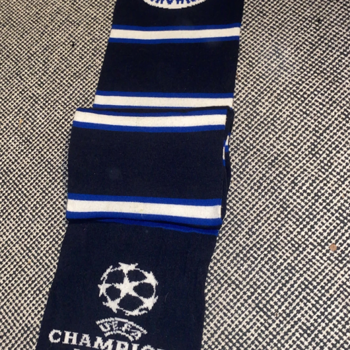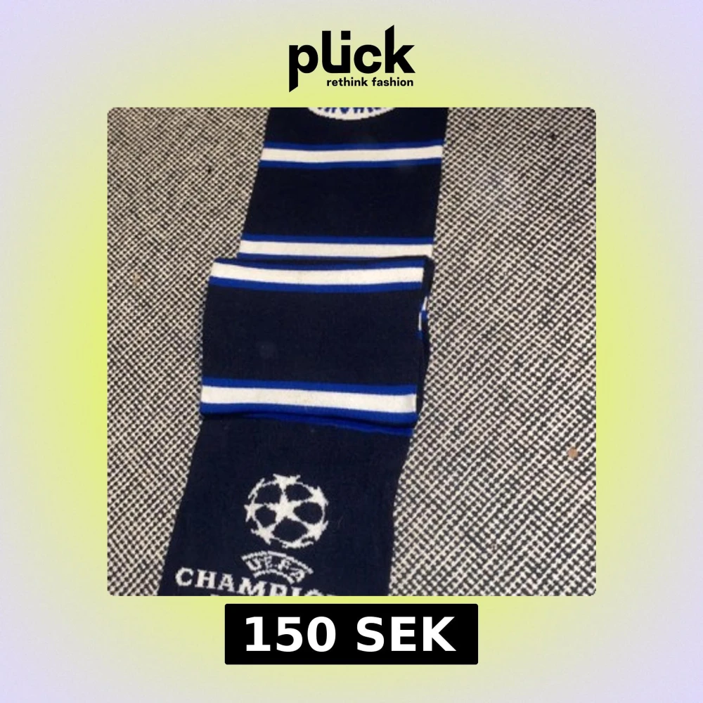 Snygg halsduk i blått och vitt med Champions League-motiv och fransar i ändarna. Perfekt för fotbollsfans som vill visa sitt stöd. Den har ett randigt mönster och är märkt med UEFA Champions League.