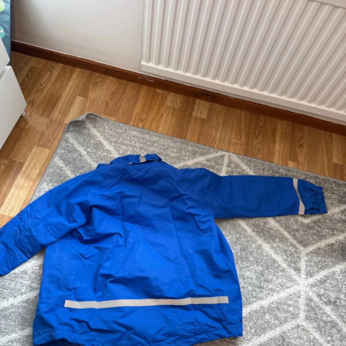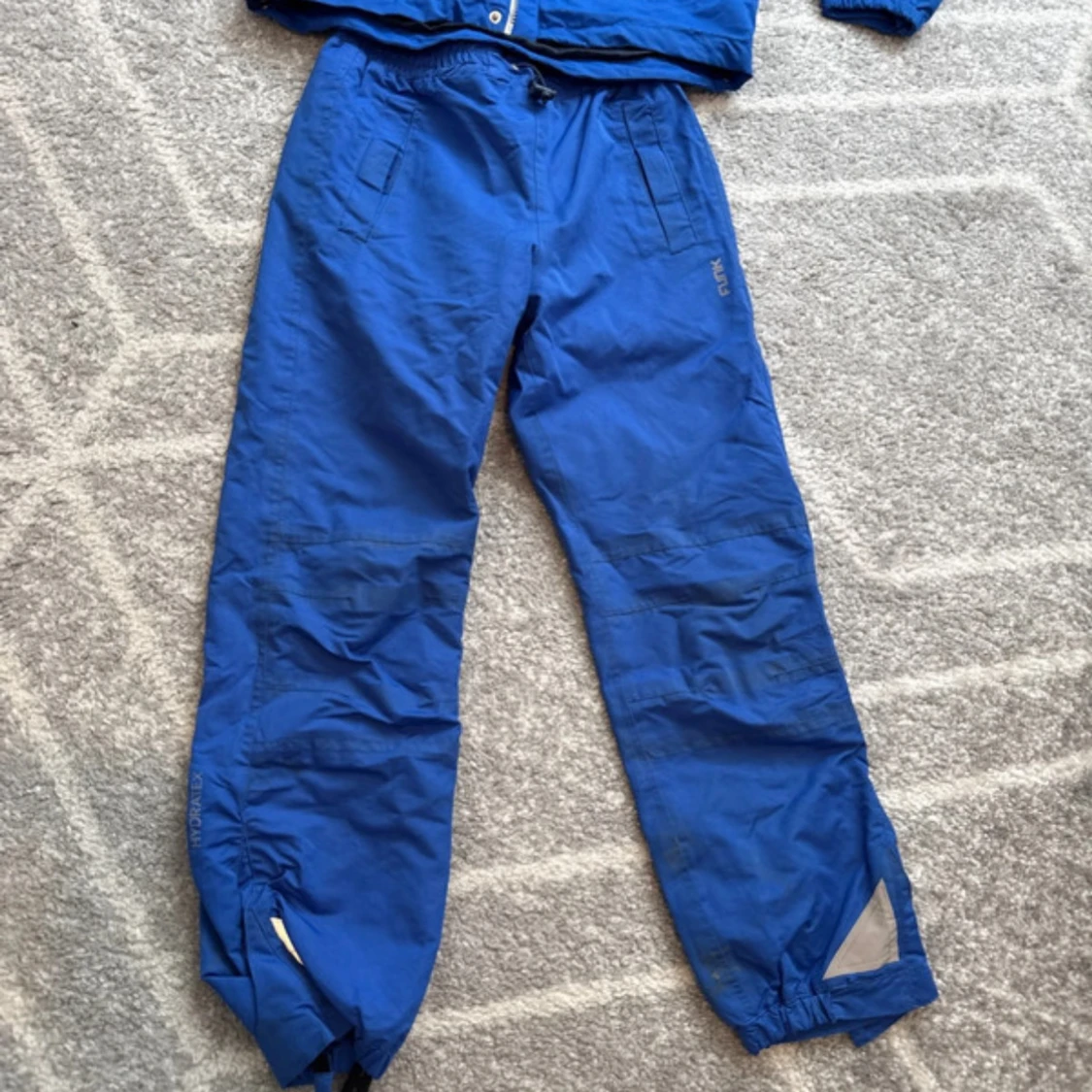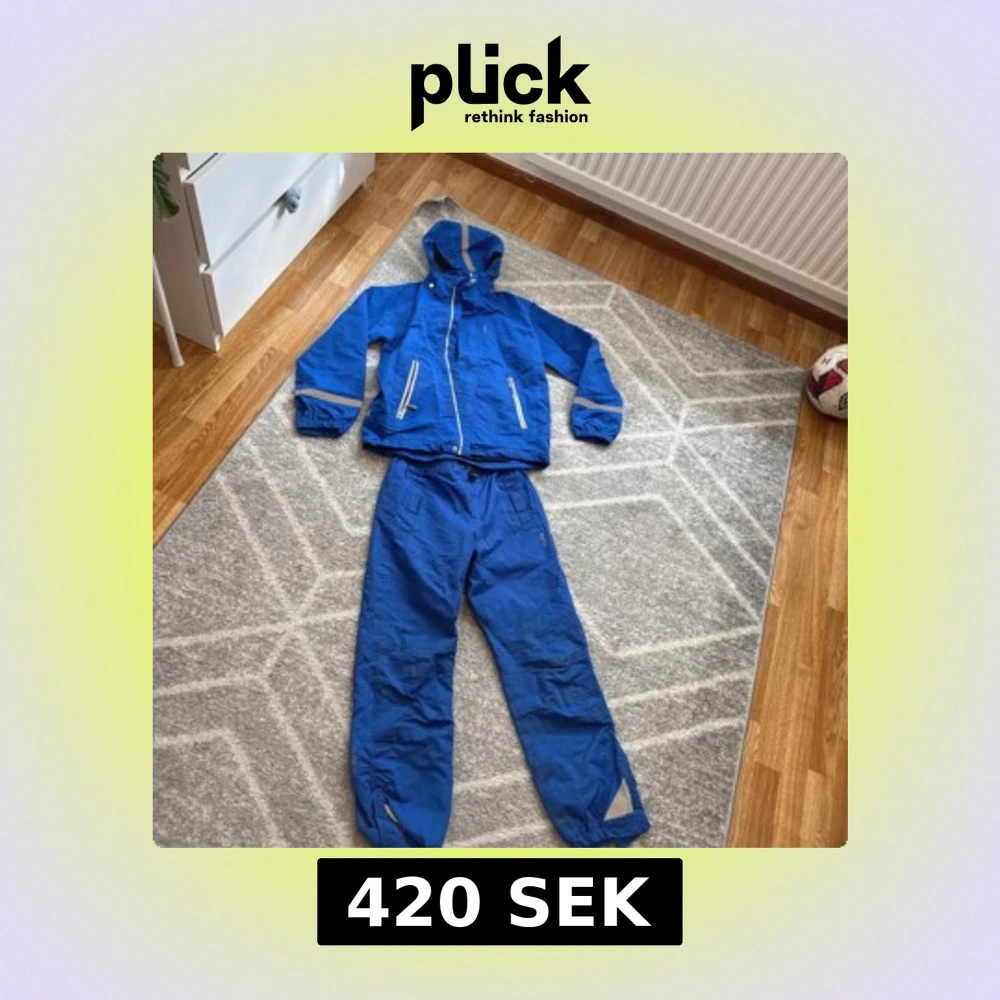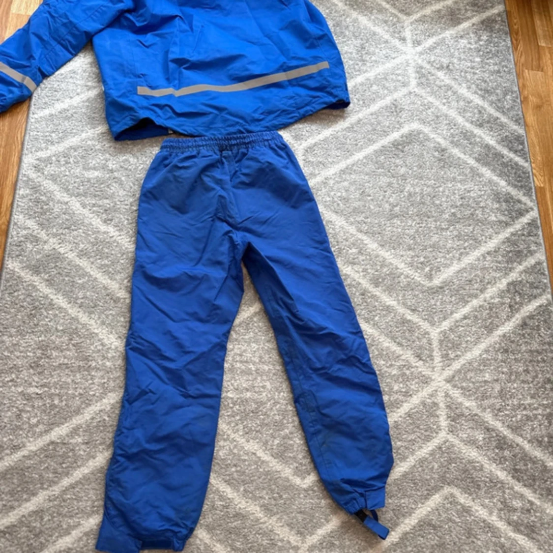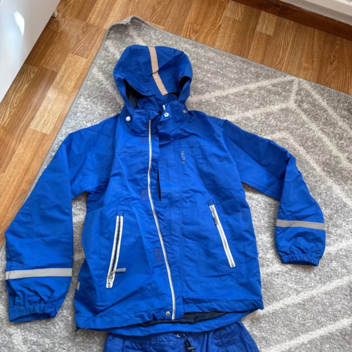 Blått tvådelat skalset från FIX med jacka och byxa. Jackan har huva, dragkedja, reflexdetaljer på ärmar och rygg samt praktiska fickor med dragkedja. Byxorna har resår i midjan och reflexdetaljer vid benslut. Perfekt för utomhusaktiviteter under vår och höst. Lite fläckiga vid benslutet men borde försvinna om man tvättar.