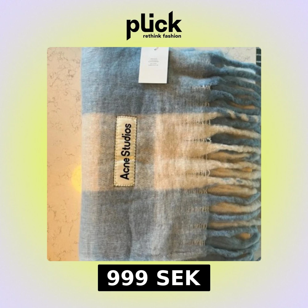 Säljer en stor och fluffig halsduk från Acne Studios i en mjuk blandning av blågrå och beige rutor. Halsduken har fransar i kanterna och en tydlig Acne Studios-logga. Perfekt för att ge din outfit en cool touch under kyliga dagar. Hör av dig vid minsta fråga!