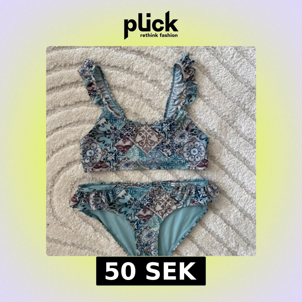 Endast använd en gång, så nyskick! Superfin bikini från KappAhl i storlek 158/164 med blått och turkost patchworkmönster. Både överdel och underdel har volangdetaljer på axelband och sidor. Materialet är mjukt och stretchigt, perfekt för sommardagar vid stranden eller poolen.