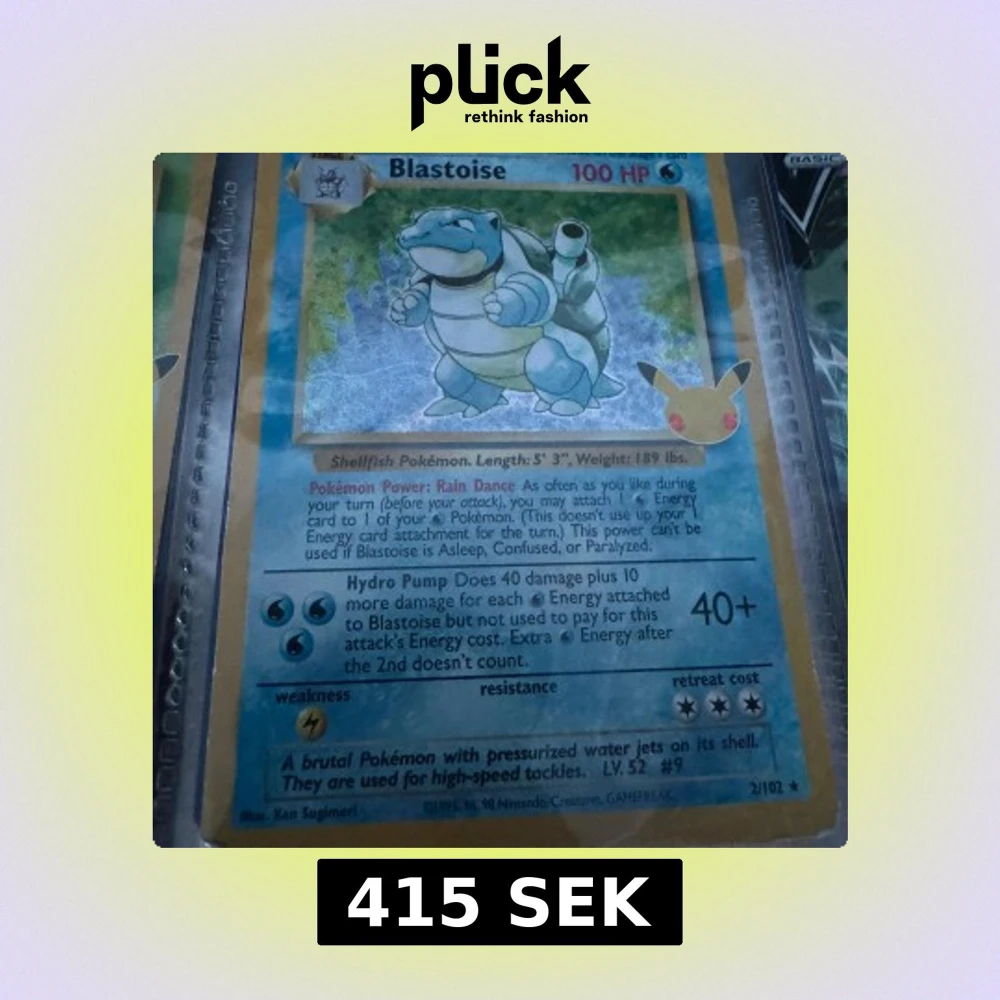 Säljer ett Blastoise Pokémonkort från Base Set, nummer 2/102. Kortet har blå bakgrund, holografisk yta och visar Blastoise med vattenkanoner på ryggen. Text och HP i rött och svart, samt Pokémon-logga i hörnet. 1995