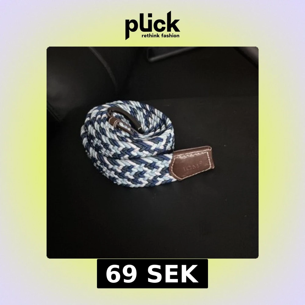Säljer ett snyggt flätat bälte i olika blå nyanser med bruna läderdetaljer från IGAN. Bältet har ett randigt mönster och passar perfekt till jeans eller chinos. Spännet är i metall och bältet är flexibelt och bekvämt.