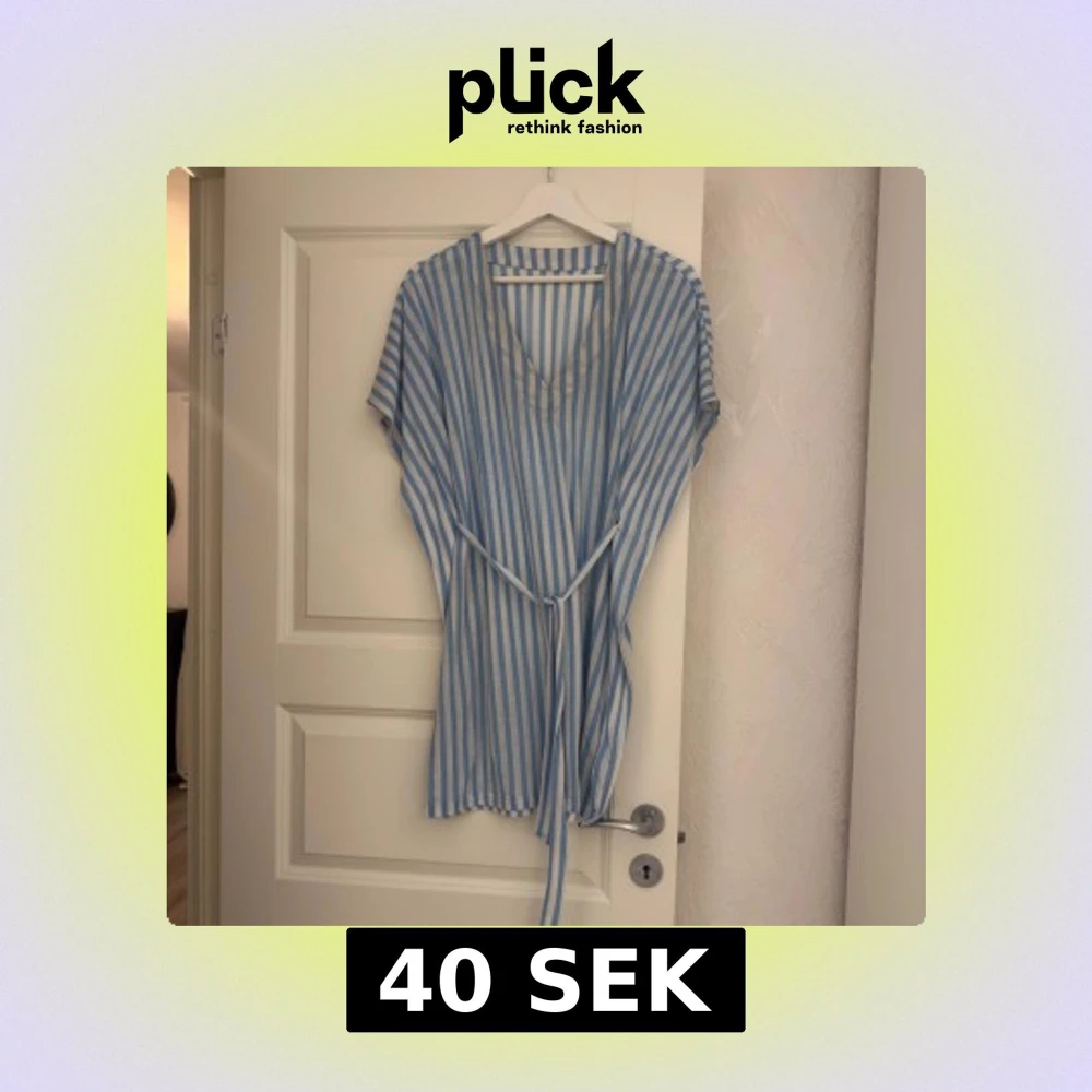 Superfin kort strand klänning i blåvitt randigt med v-ringning och knytband i midjan från H&M. Lätt och luftig modell med korta ärmar, perfekt över badkläder. Materialet känns som bomull eller linne. Då den är köpt för några år sedan säljer jag den billigt.