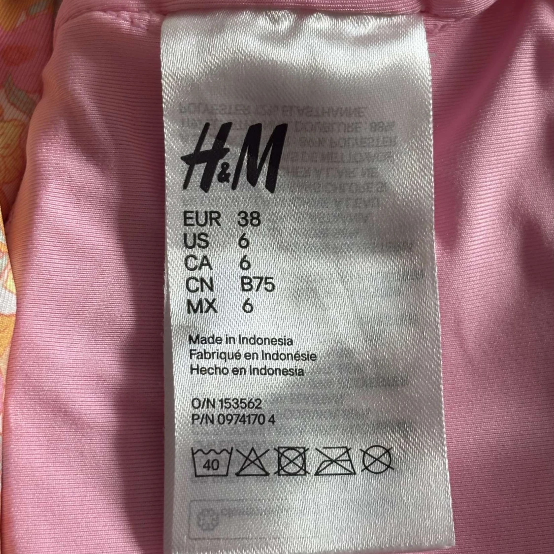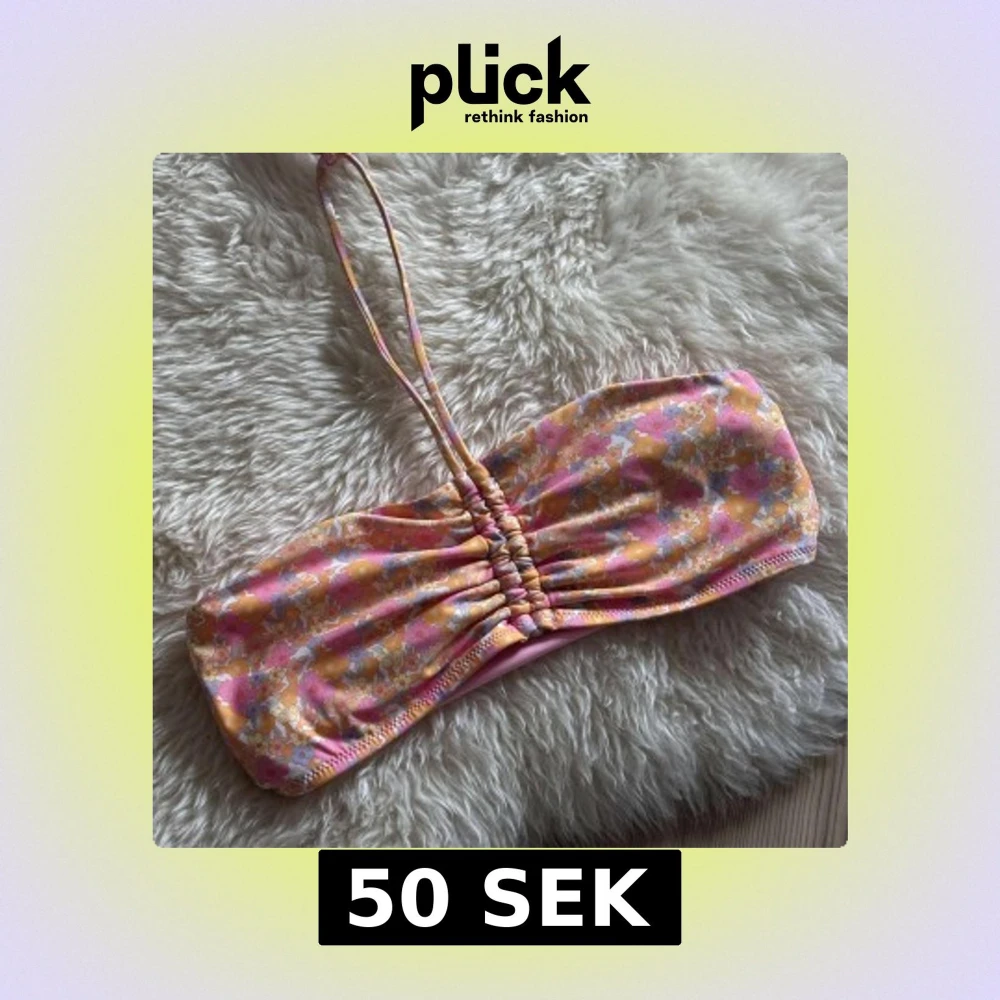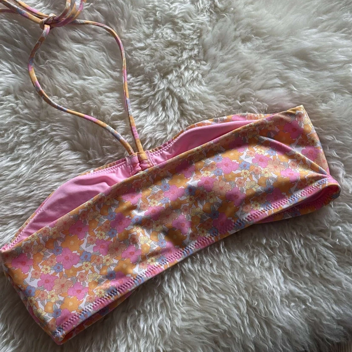 Superfin bandeau bikiniöverdel från H&M med blommigt mönster i rosa, orange och ljusblått. Toppen har smala axelband som kan knytas och rynkade detaljer framtill. Perfekt för sommardagar vid stranden eller poolen!