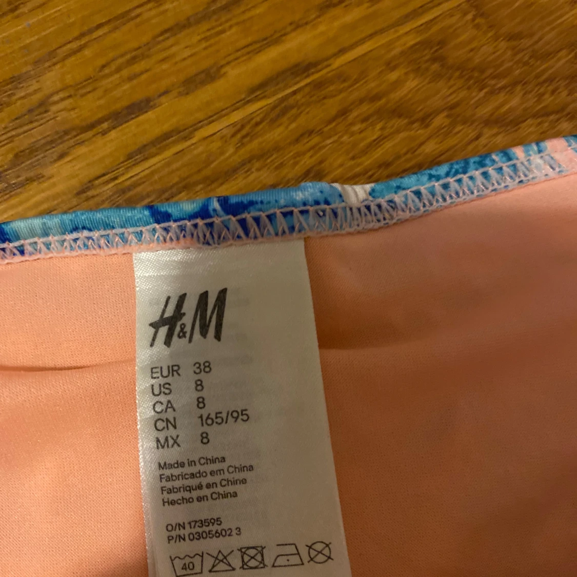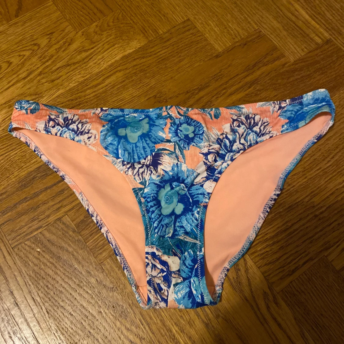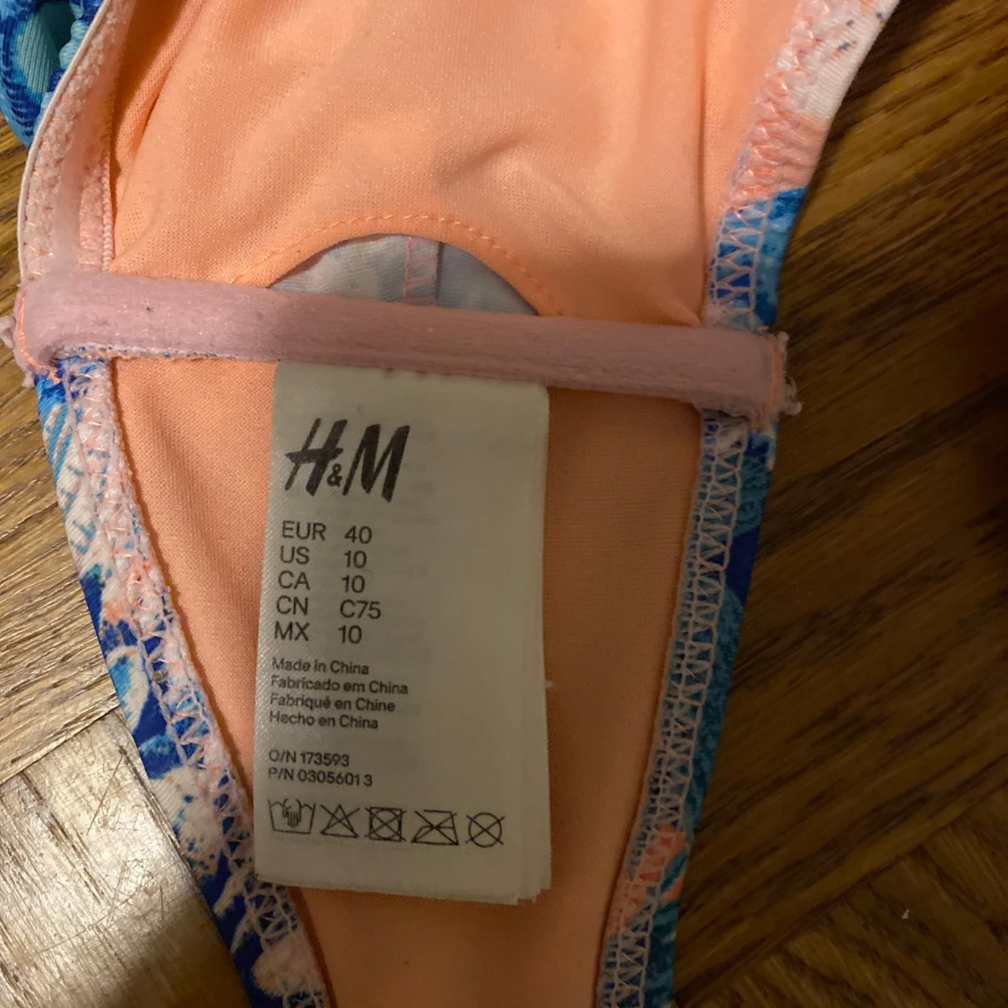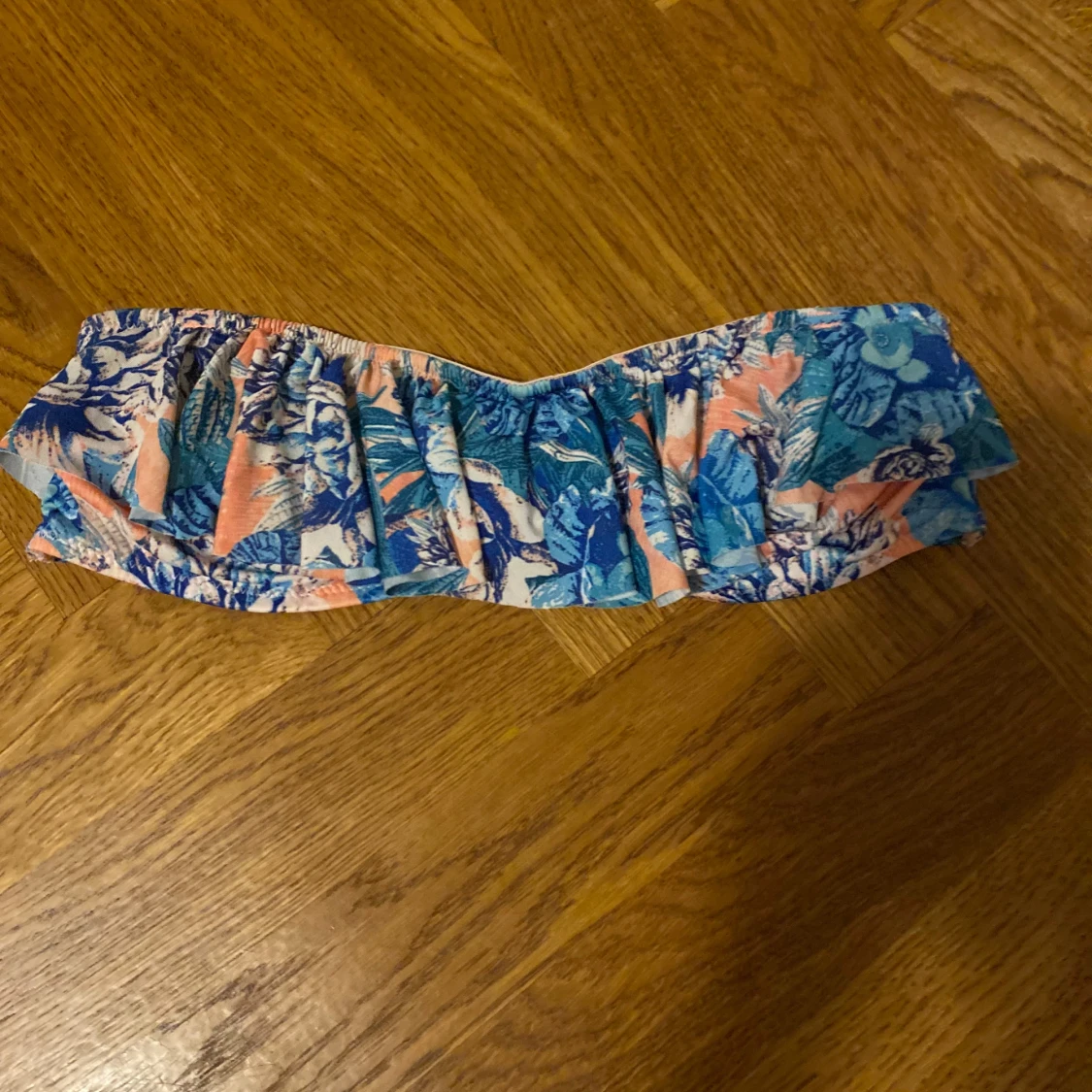 Snygg bikini från H&M med blommigt mönster i blått och orange. Överdelen är axelbandslös med volangdetaljer och underdelen har en klassisk passform. Perfekt för sommarens stranddagar!
