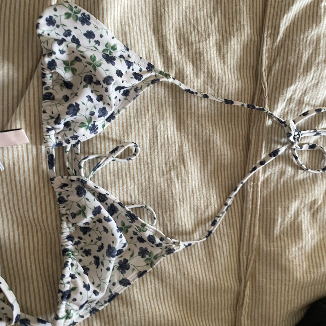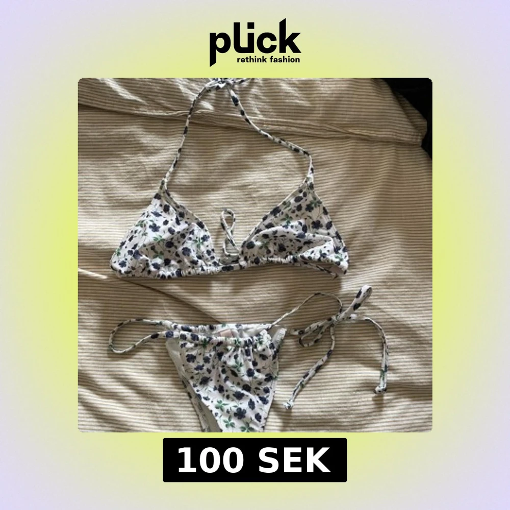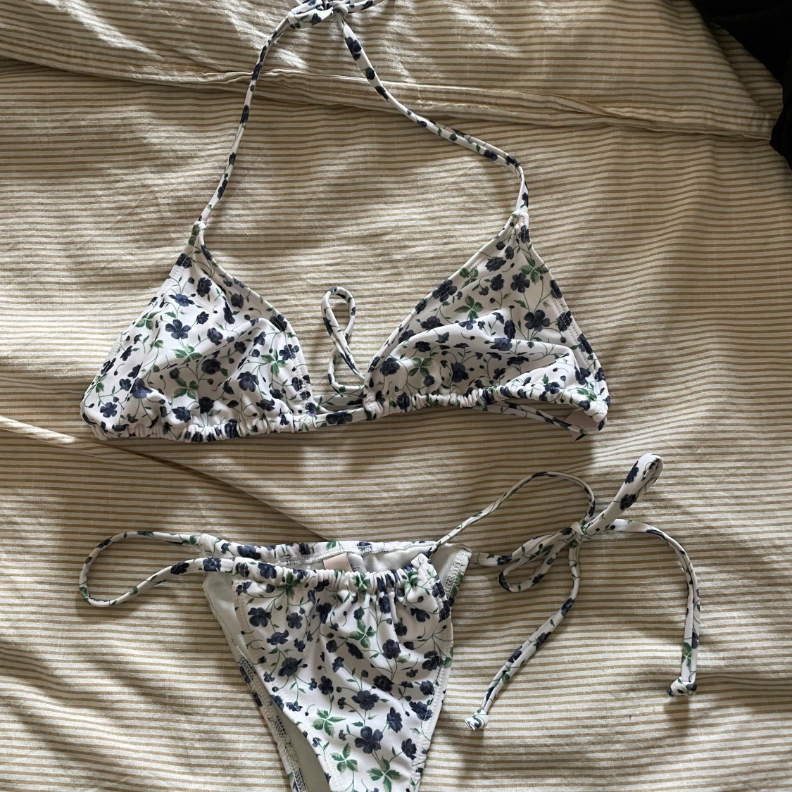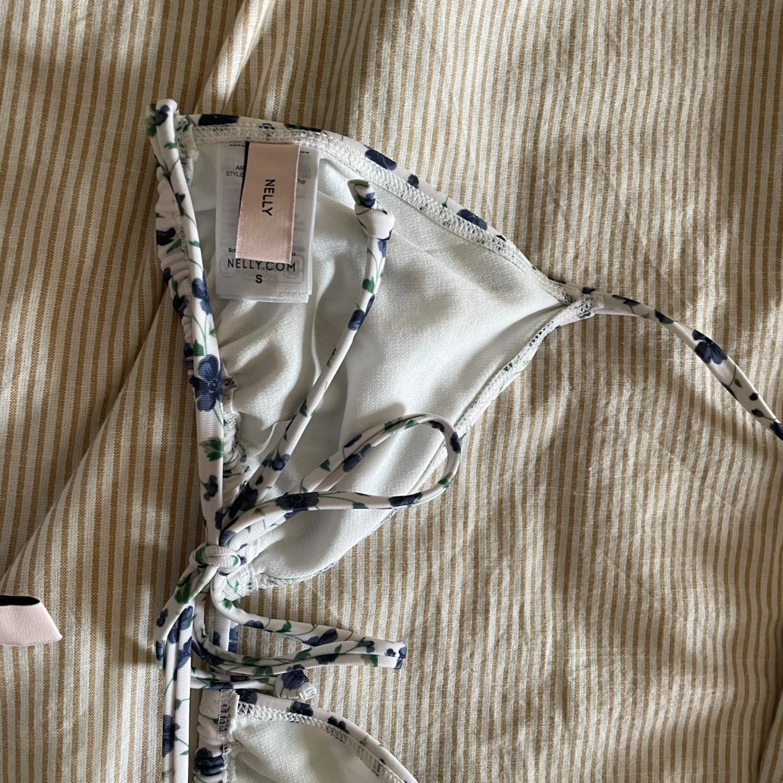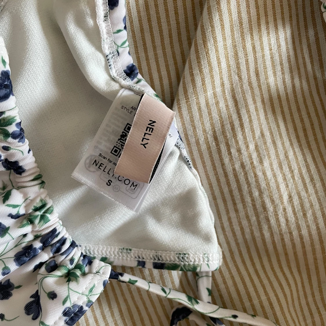 Supersöt trekantsbikini från Nelly i vitt med blått och grönt blommönster. Både överdel och underdel har knytband i sidorna och runt nacken, vilket gör den enkel att justera. Perfekt för strandhäng och sommarvibbar!