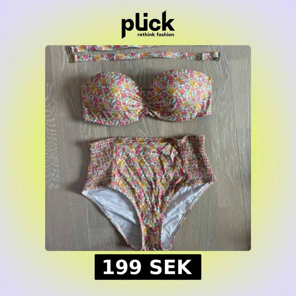 Säljer en söt blommig bikini med bandeau-topp och högmidjade trosor. Överdelen är i storlek 85C och trosorna 38/40. Använda vid ett tillfälle och självklart tvättade!