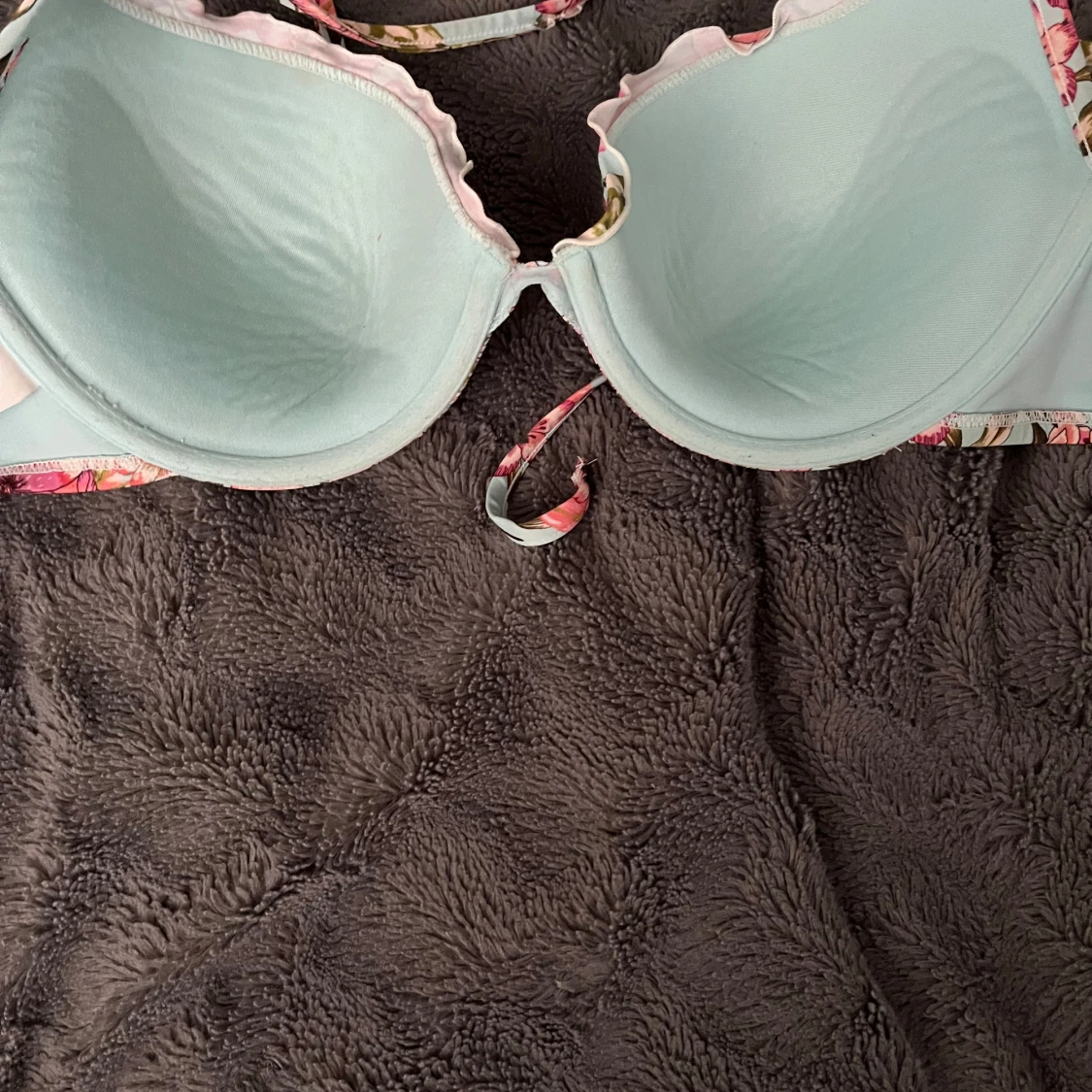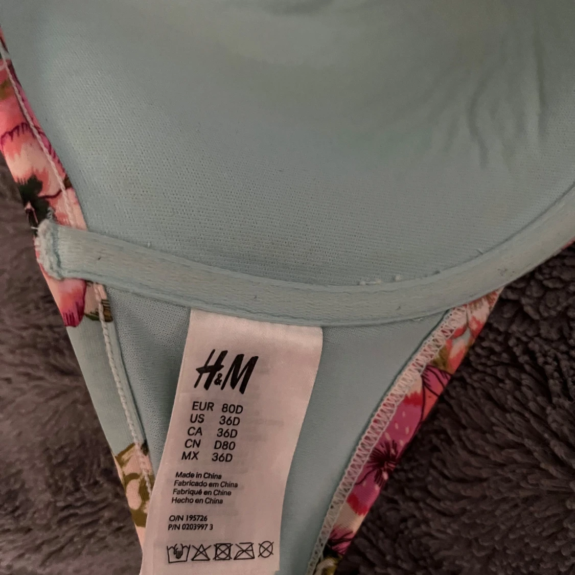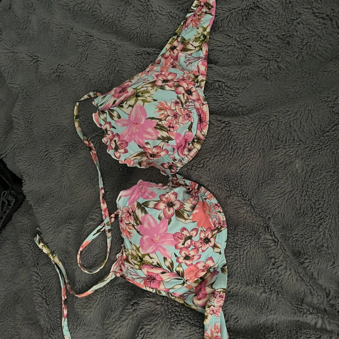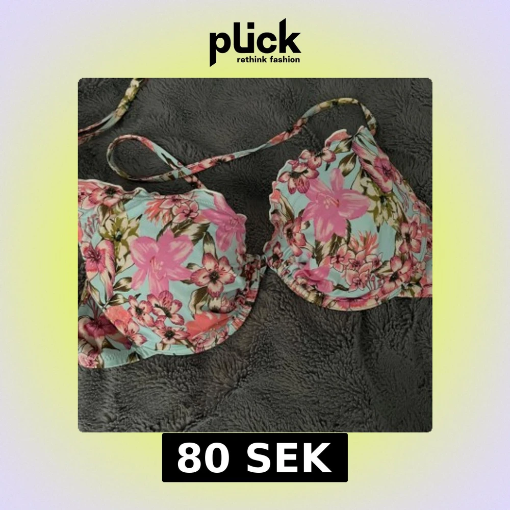 Superfin bikiniöverdel från H&M i storlek 80D. Den har ett blommigt mönster i rosa, grönt och vitt på ljusblå botten. Bikinin har vadderade kupor och knytband i nacken och ryggen. Perfekt för sommardagar vid stranden eller poolen! Vid frågor hör av dig!