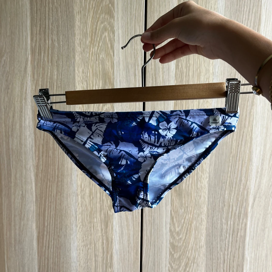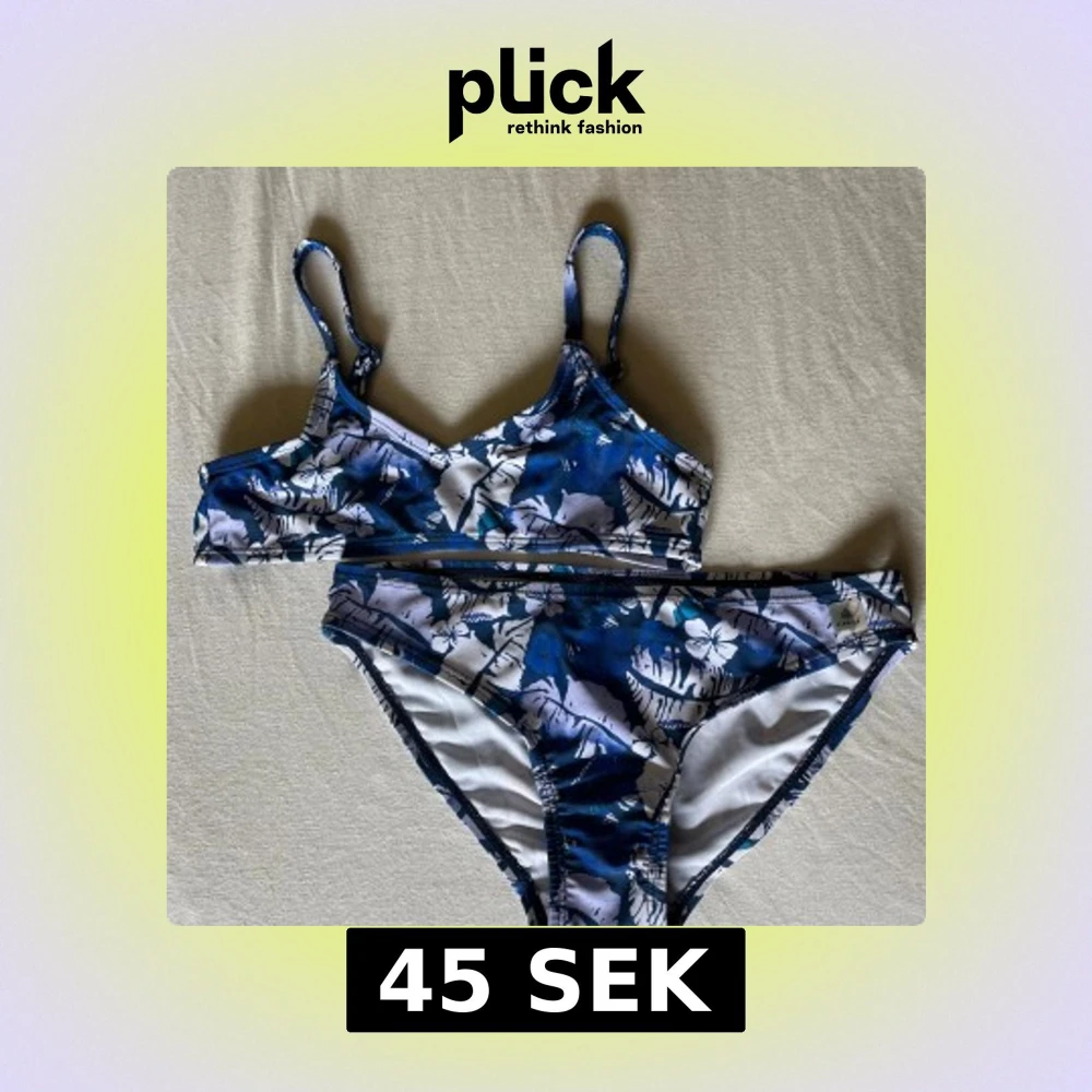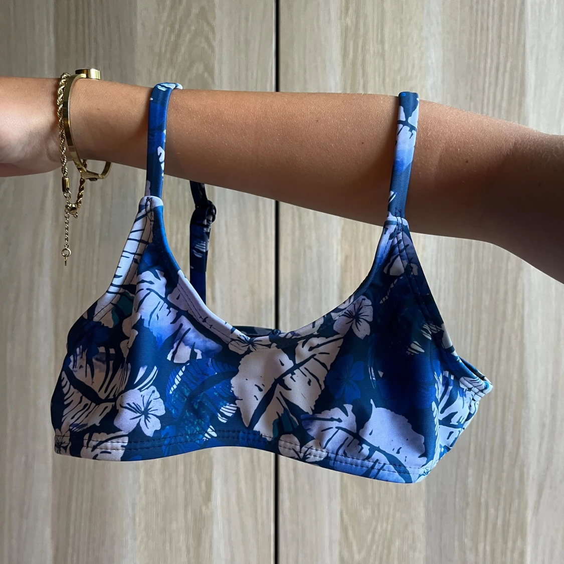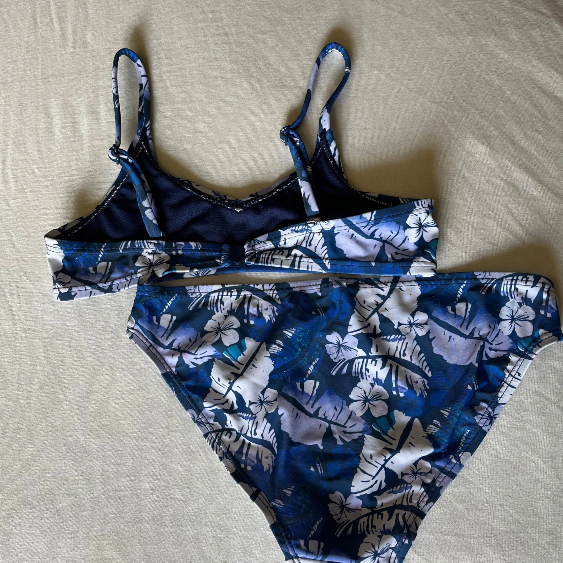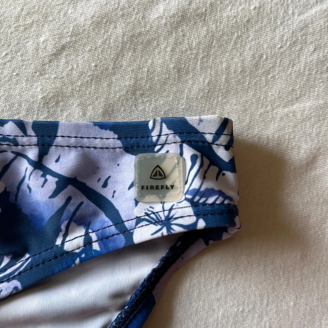 Snygg bikini från Firefly med tropiskt blommönster i blått och vitt. Toppen har smala justerbara axelband och klassisk form, medan bikinitrosan har medelhög midja. Materialet är mjukt och stretchigt syntet, perfekt för strandhäng och pool.