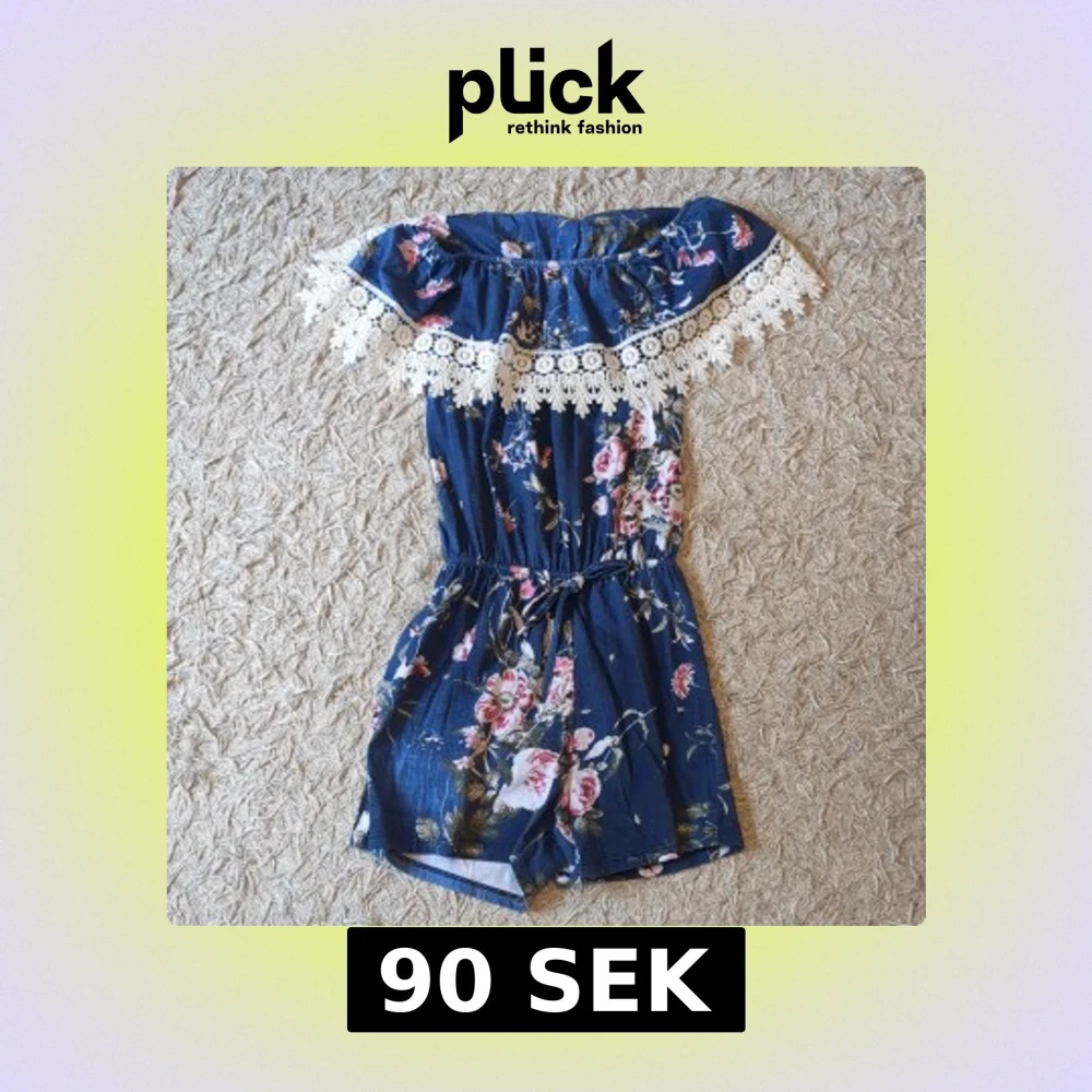Supersöt blå byxdress med blommigt mönster och offshoulder-modell. Den har vit spetsdetalj upptill och resår i midjan för en snygg passform. Perfekt för varma dagar och somriga vibes!