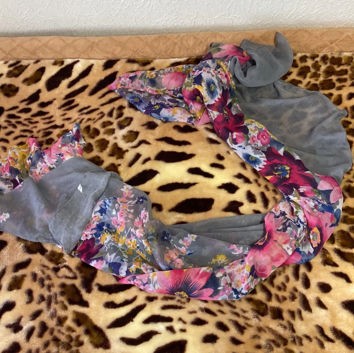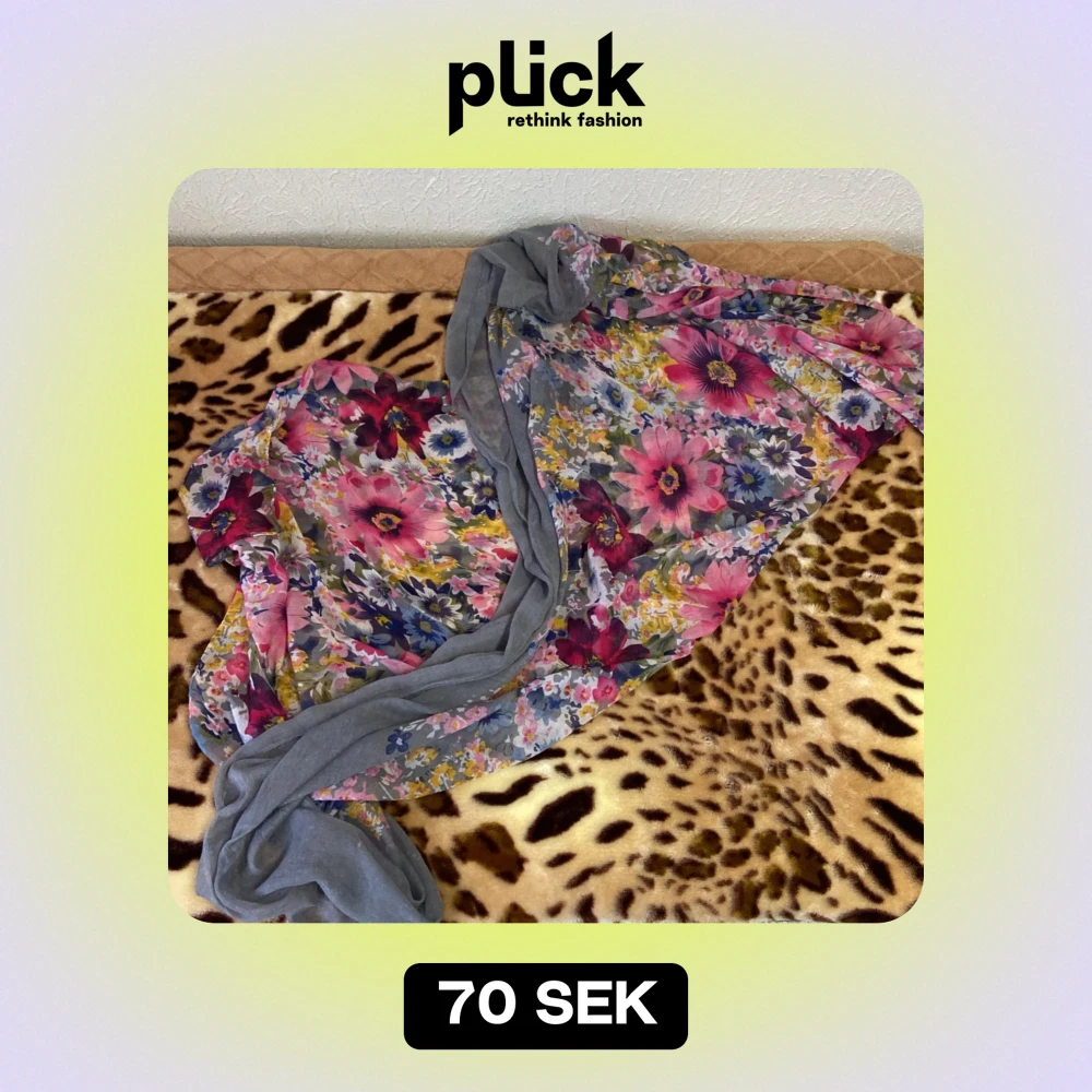 Säljer en superfin blommig halsduk med grå bas och färgglada blommor i rosa, blått och gult. Perfekt för att liva upp din outfit under höst och vår. Materialet är lätt och luftigt, vilket gör den skön att bära. Passar både till vardags och fest! 🌸
