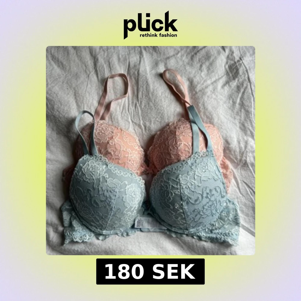 Två söta behåar med blommig spets, en i ljusblå och en i ljusrosa. Båda har metallcharm framtill. Använt en gång. Ena är 80B och den andra 75b