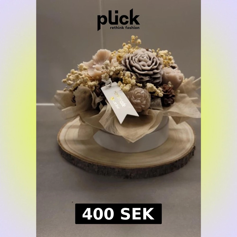 Unikt handgjort ljusarrangemang med blommor i beige och bruna toner, formade som rosor och pioner. Dekorerat med torkade små blommor och placerat på en rund vit box.. Perfekt som dekorativt smycke för hemmet eller present.