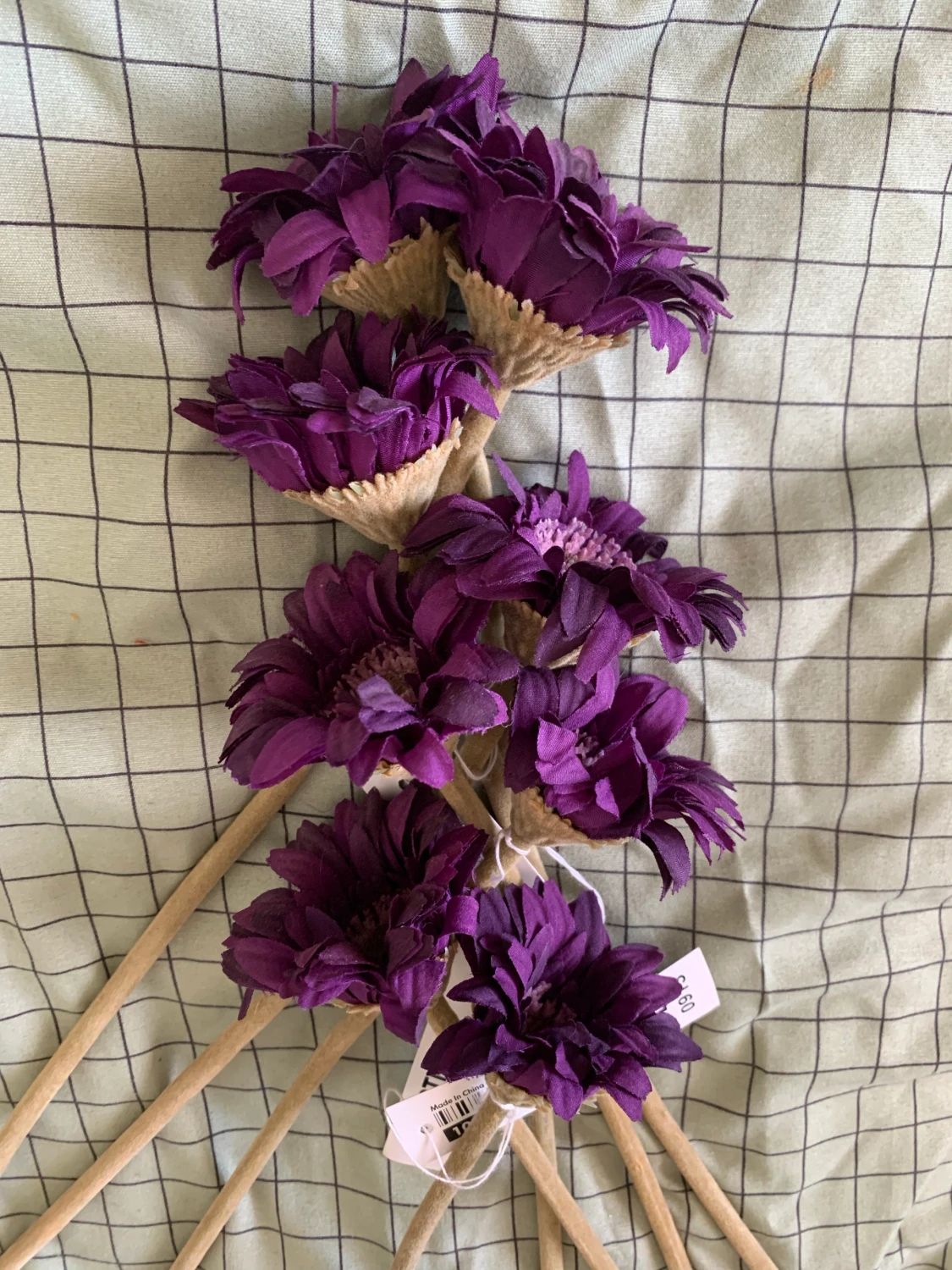Säljer lila plast blommor från Ikea!🌺 jätte fin dekoration som knappt är använda och fortfarande har tagg med längd (33 cm) köpt för 19kr styck! Org pris 8x19: 152kr💗