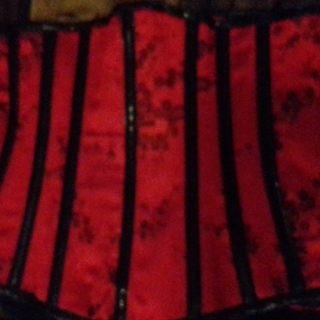Korsett i fint skick, passar någon som är xs till s i storlek. Blommigt mönster i svart och rött. Snörning baktill i rygg.