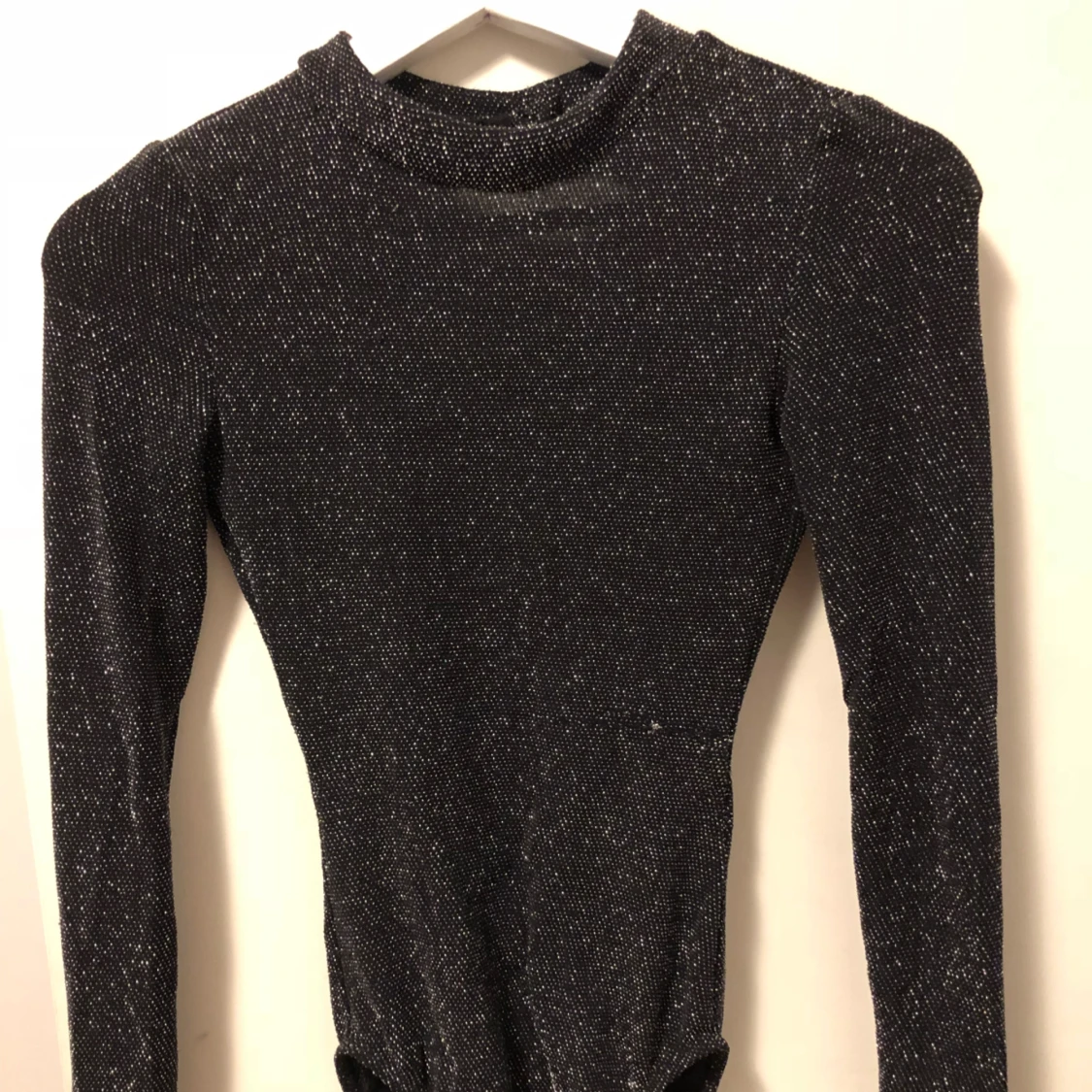 Glittrig body med öppen rygg, storlek XS.