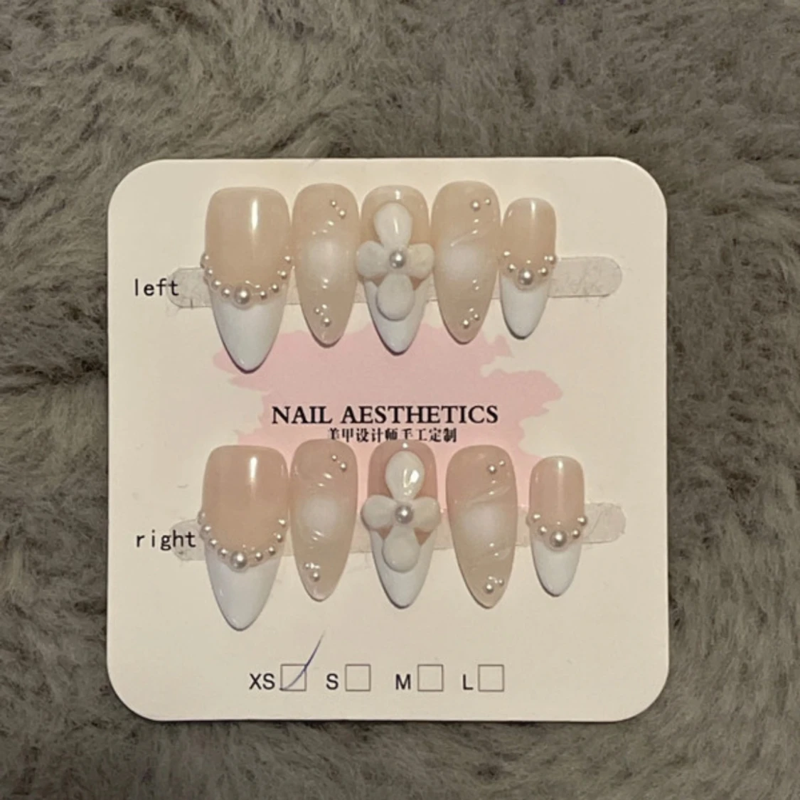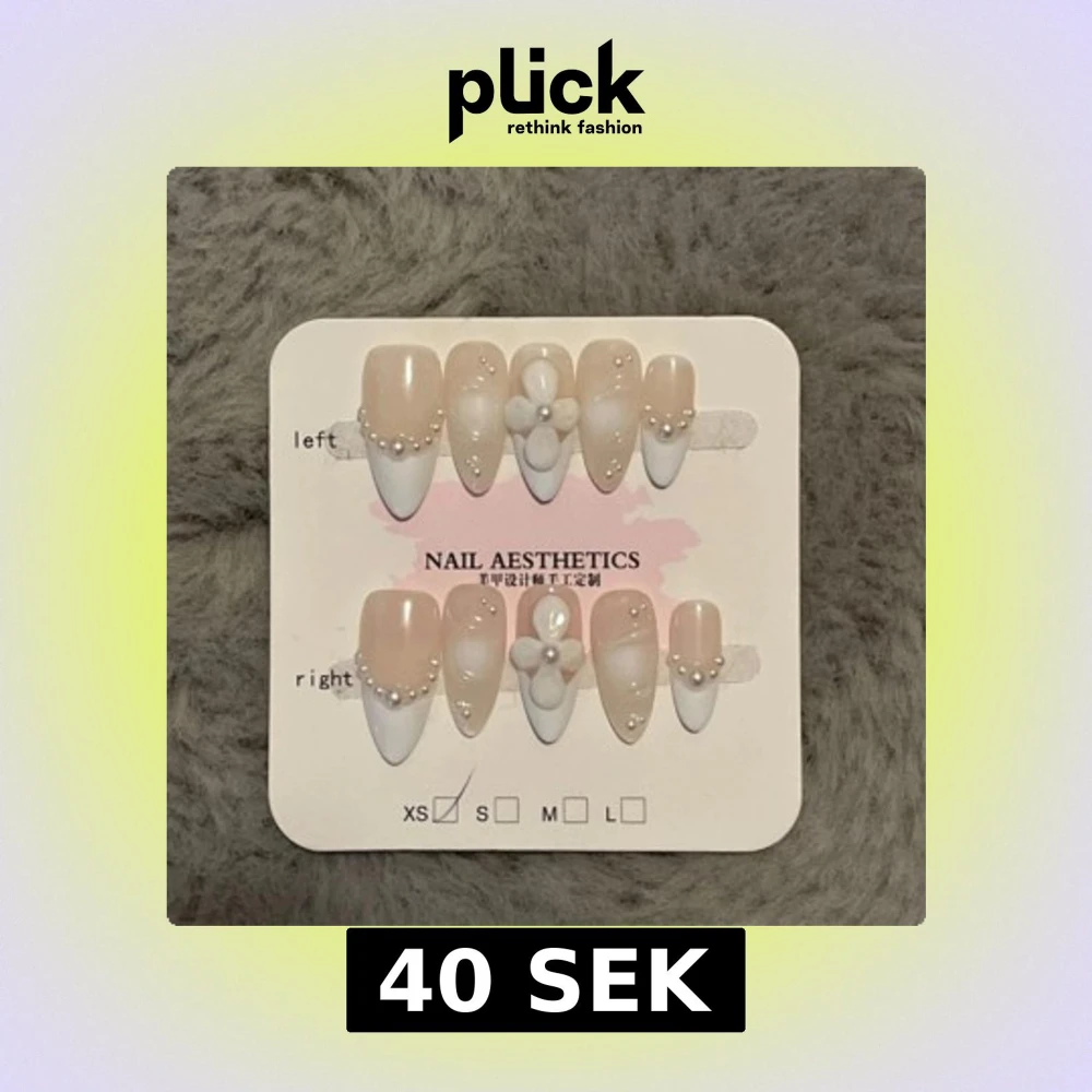 Bridal inspired press on nails đ Handgjorda lösnaglar i storlek XS som Ă€r lite tjockare och tĂ„liga för att likna akryl naglar. Det gör sĂ„ att de hĂ„ller lĂ€ngre eller gĂ„r att Ă„teranvĂ€ndas! Aldrig anvĂ€nda. SĂ€ljer de för de Ă€r för smĂ„ för mig. Tumnagelns bredd Ă€r 14mm, pekfinger 11mm, mellanfinger 12mm, ringfinger 10mm, lillfinger 8mm! Kommer med en liten nagelfil och nail glue stickers! Man kan sĂ„klart anvĂ€nda nagellim om man har!