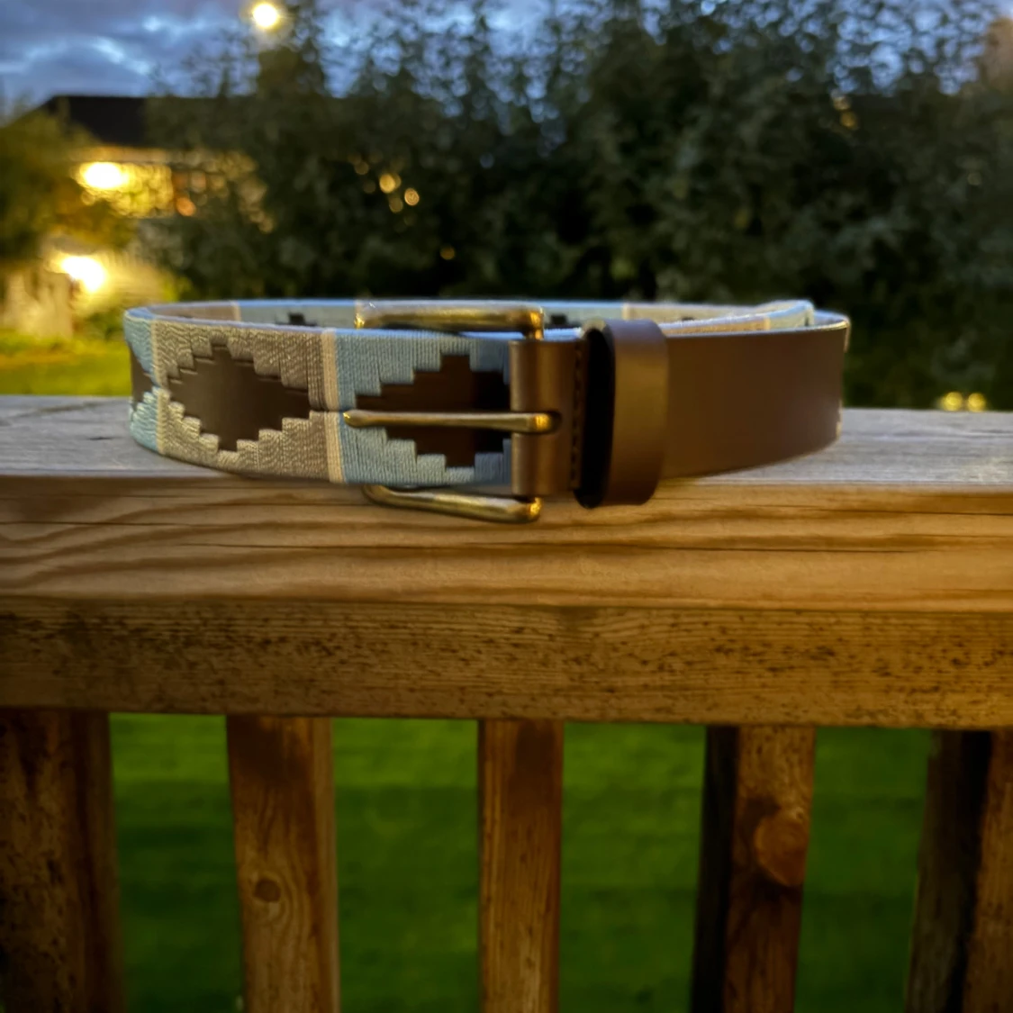 Ljus blå-grå broderat läder bälte