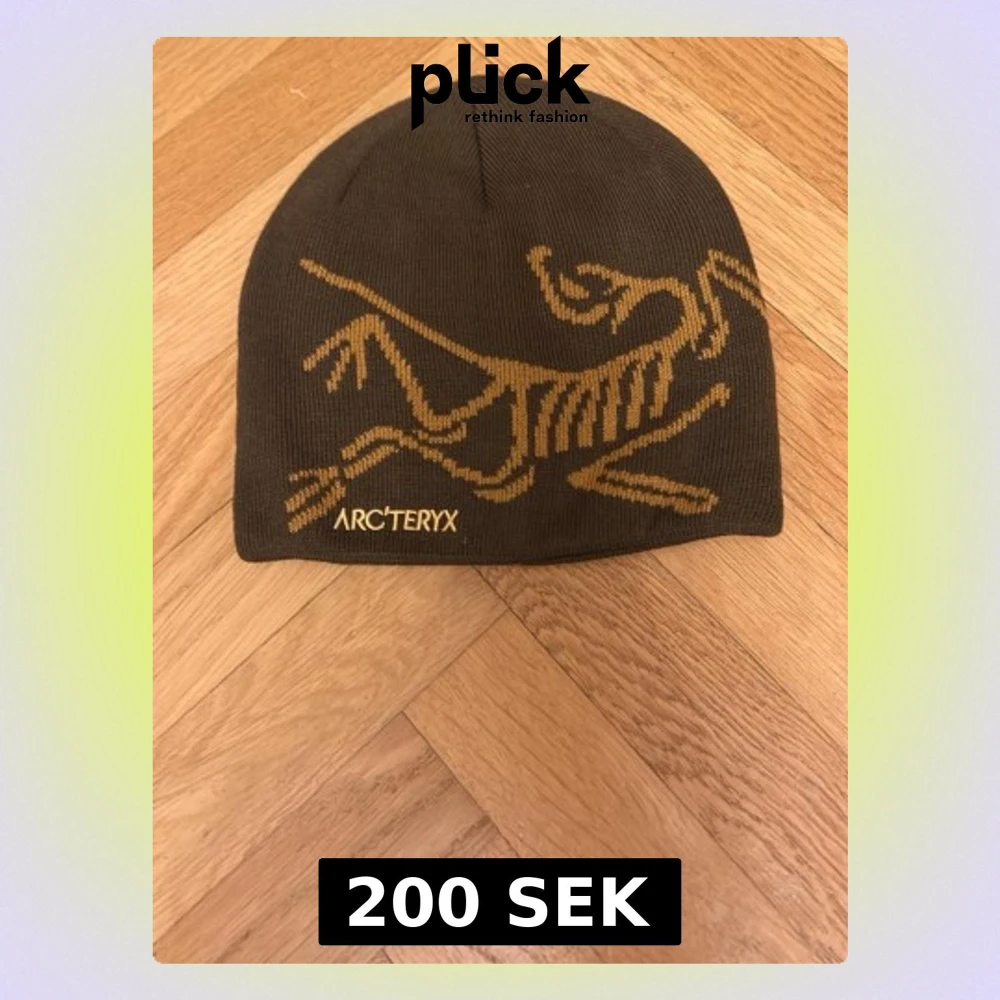 Säljer en brun mössa från Arc'teryx med ett stort guldfärgat fossiltryck på framsidan och logga broderad i gult. Mössan är stickad och har en klassisk, rundad form som sitter skönt på huvudet. Perfekt för kalla dagar.
