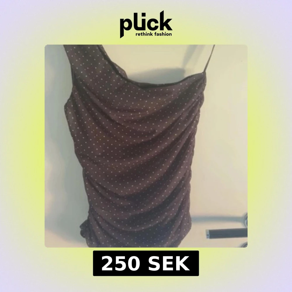 Säljer en brun body med vita prickar och omlottdrapering. Bodyn har tunna axelband och en snygg rynkad effekt längs sidorna som ger en cool siluett. Perfekt för dig som gillar prickigt och vill ha något som sticker ut.