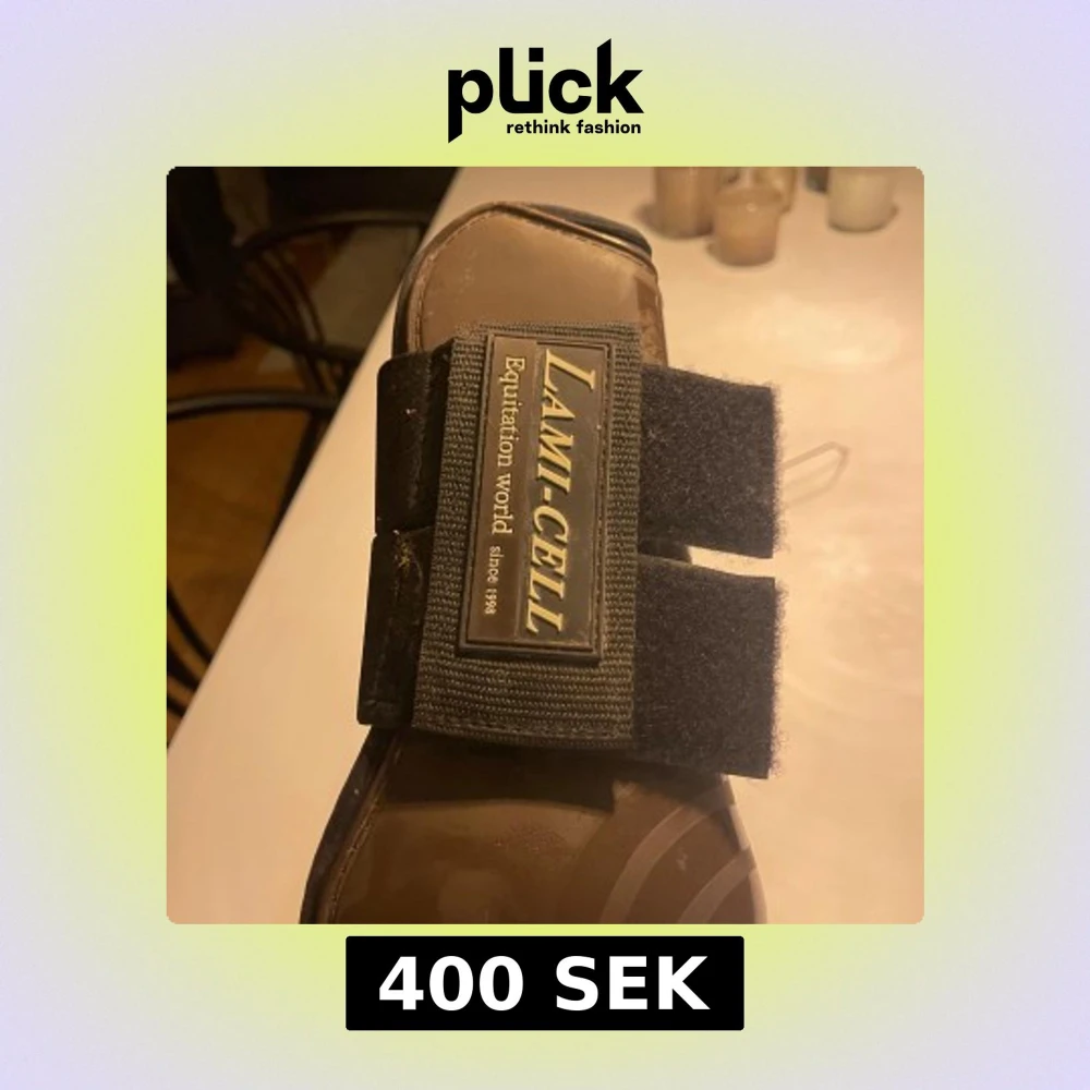 Säljer ett par bruna benskydd från Lami-Cell med robust kardborreknäppning. Ytan är i hård plast och insidan har mjukare material för komfort. Perfekta för ridning och skydd, med stilren design och tydlig logga på remmen.