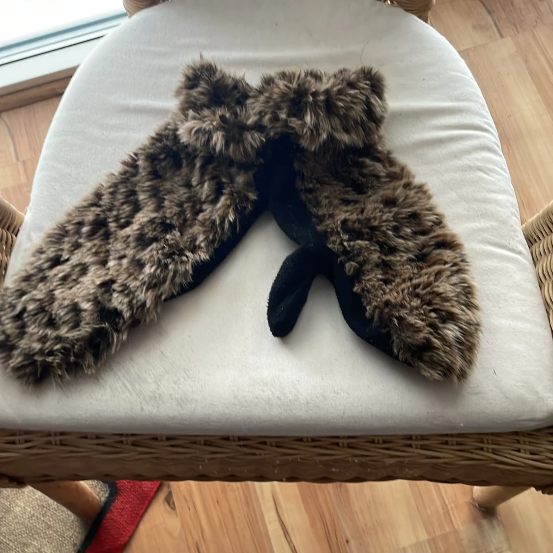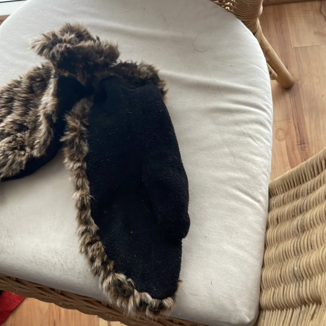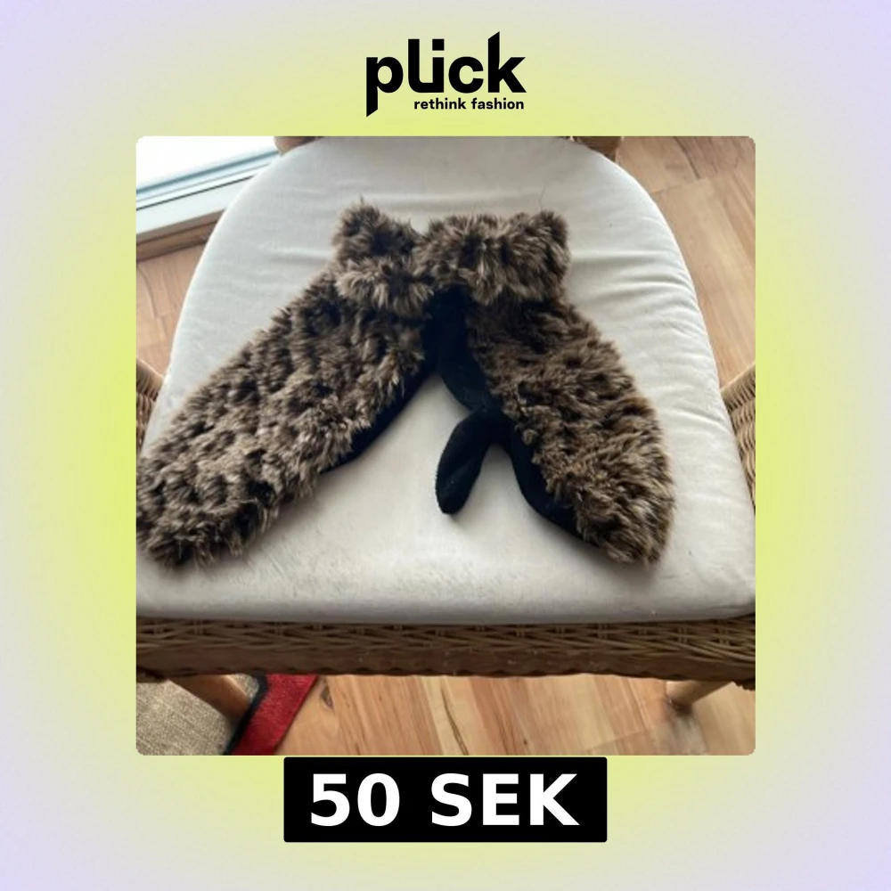 Säljer ett par mysiga bruna pälsvantar med svart insida. De har en fluffig yta