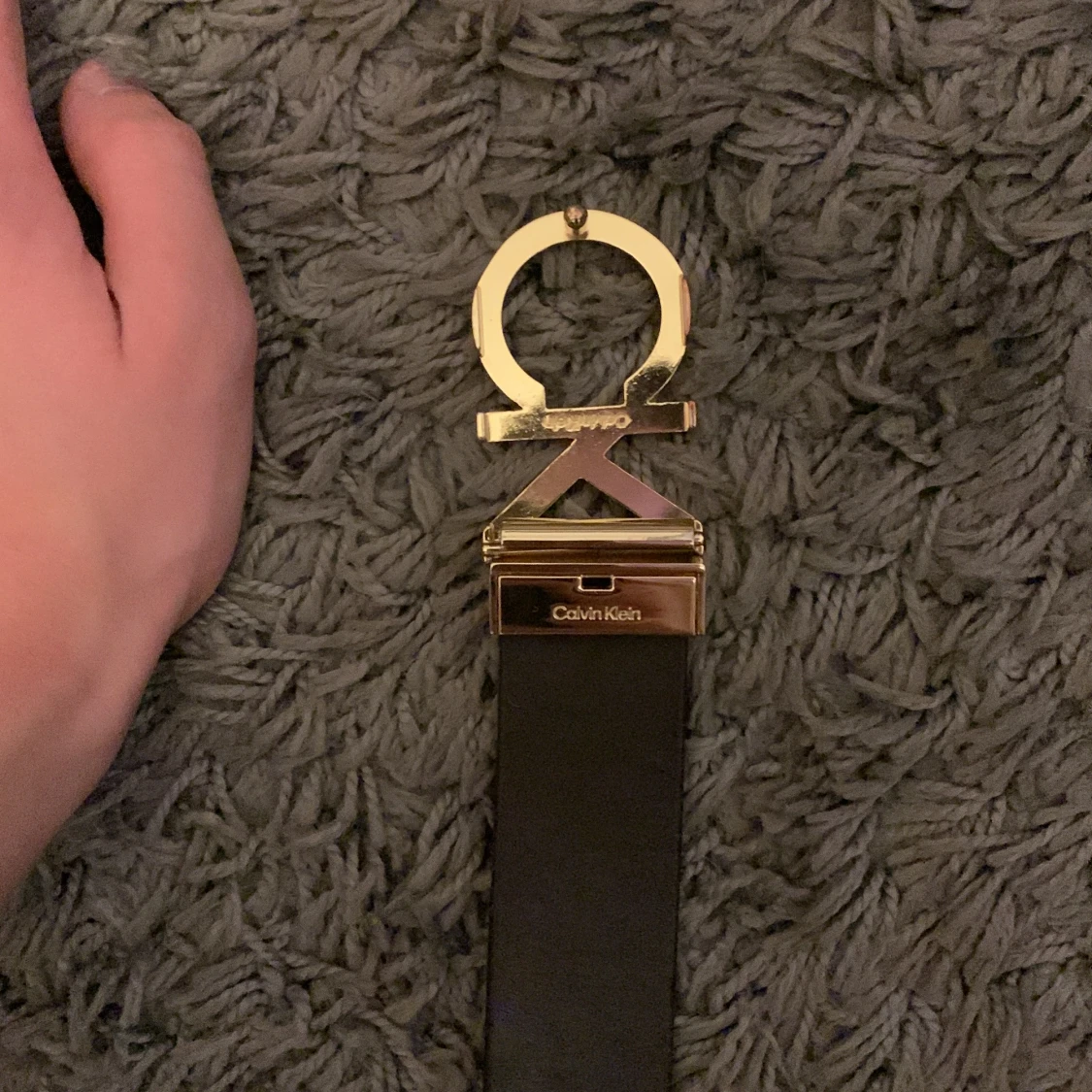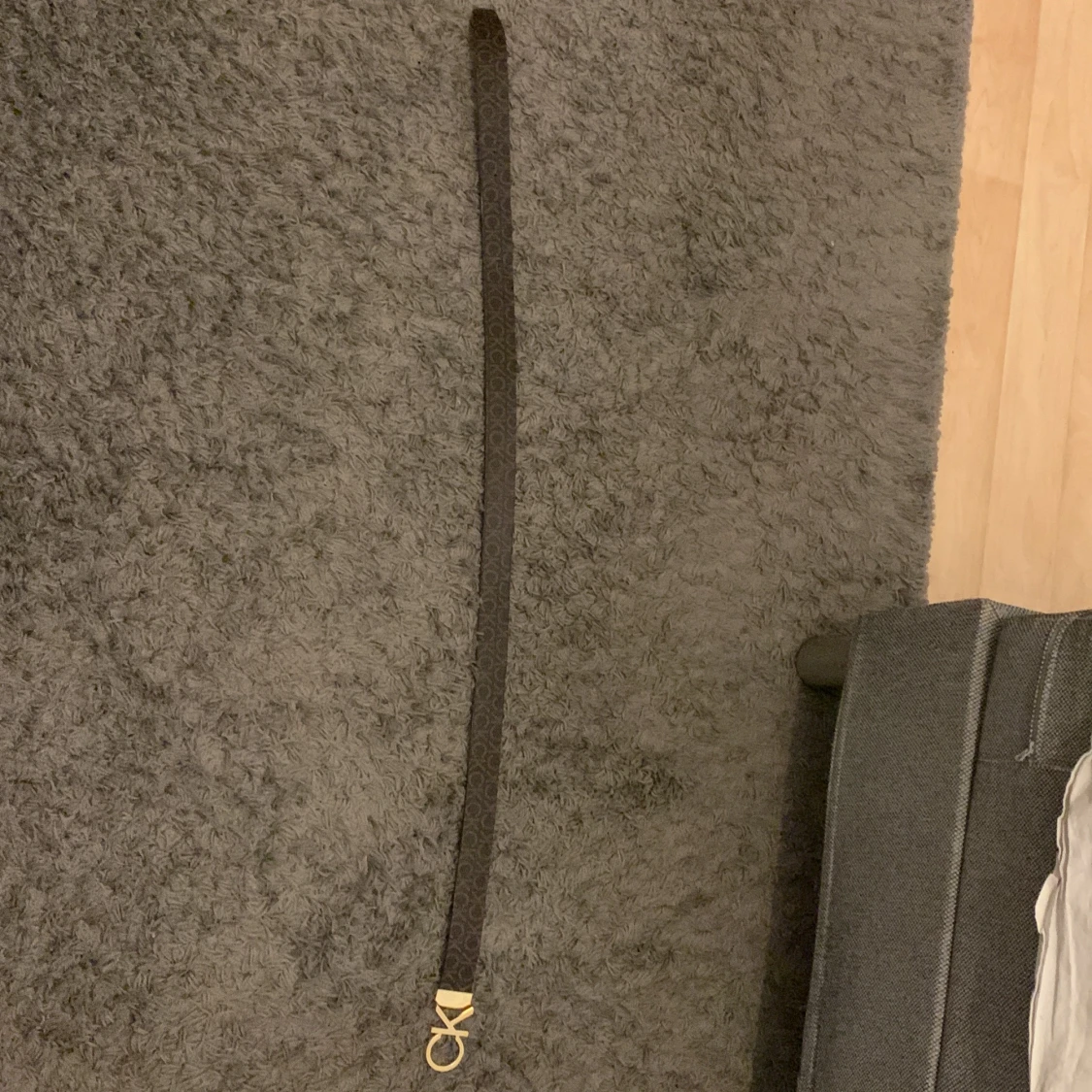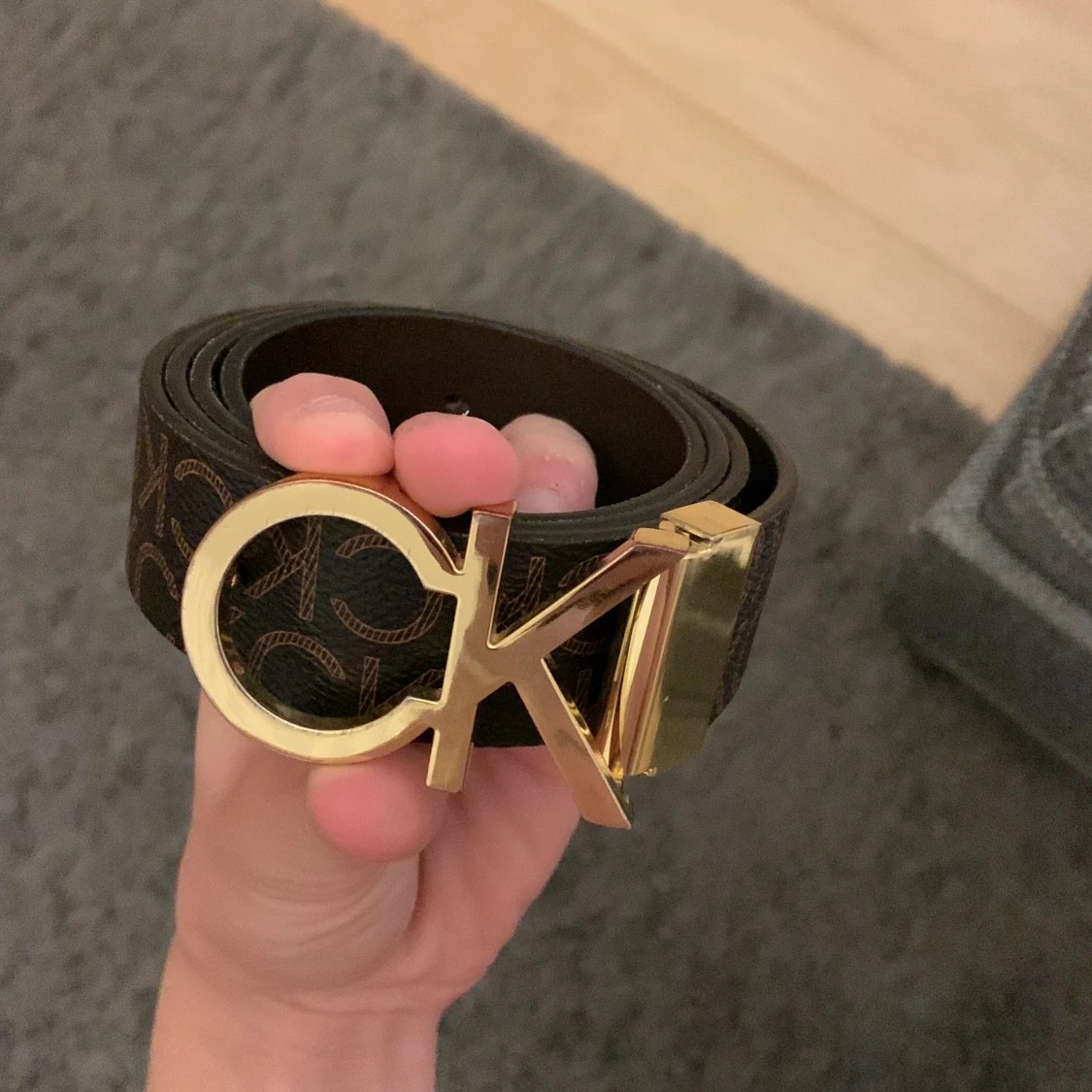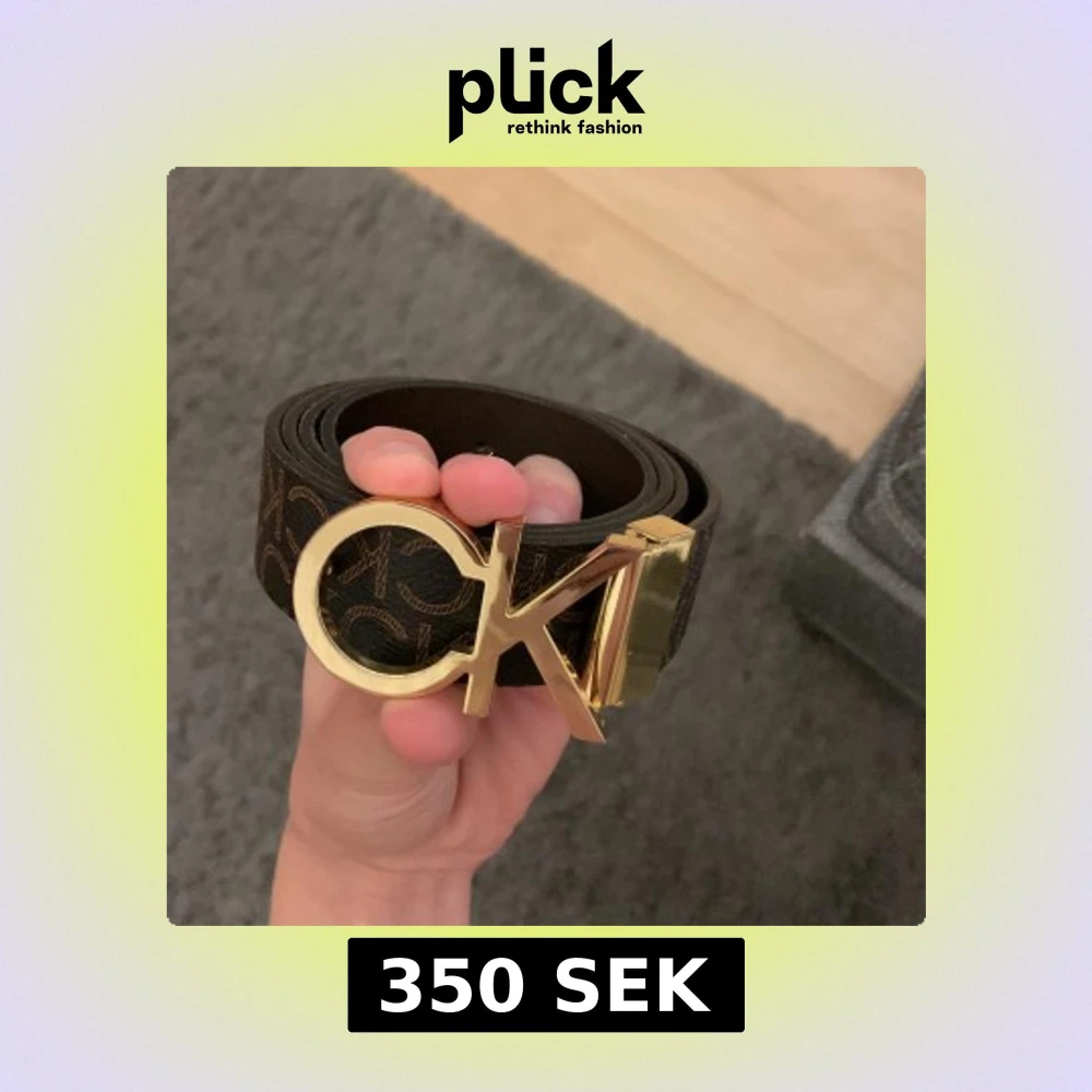 Snyggt brunt bälte från Calvin Klein med klassiskt CK-mönster och ett stort, glansigt guldspänne. Bältet är gjort i skinn och har en stilren design som lyfter vilken outfit som helst. Perfekt för dig som gillar att sticka ut med detaljer.