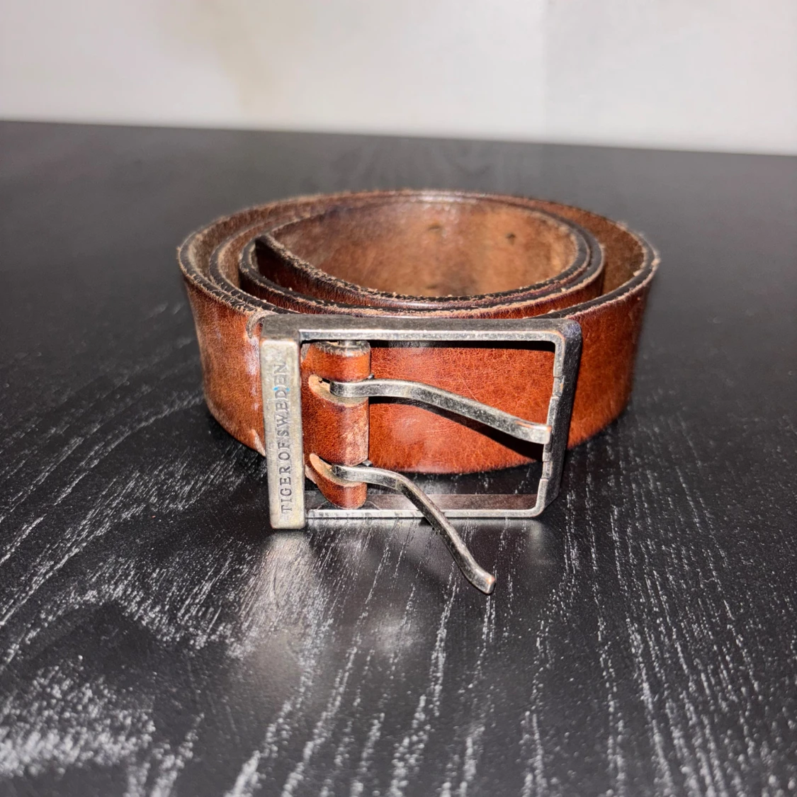 Snyggt brunt bälte från Tiger of Sweden i äkta skinn med en robust, fyrkantig metallspänne där märket är ingraverat. Perfekt accessoar för att lyfta din outfit med en klassisk och stilren touch.