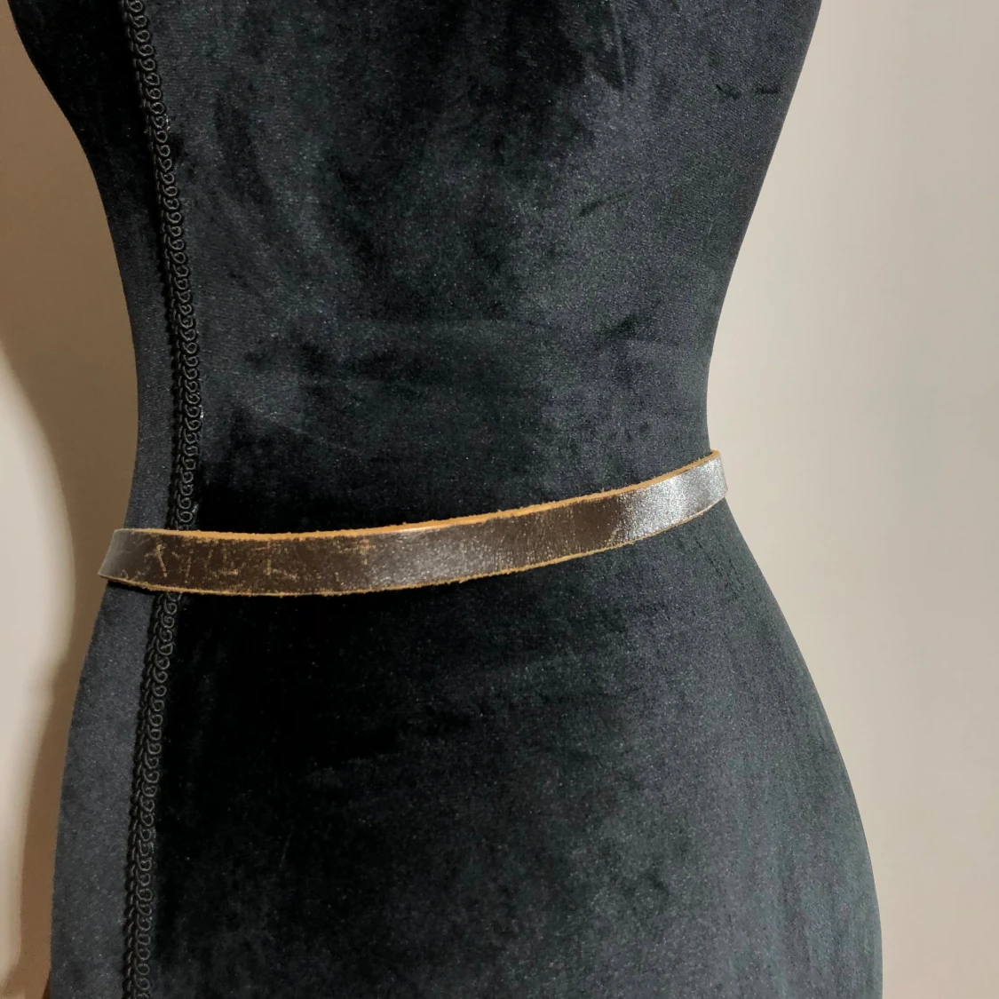 Brunt skärp i läder som är vintage. Längd ca 95cm. Pris: 10kr