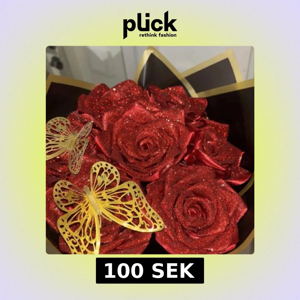 En lyxig bukett med konstgjorda röda rosor täckta av glitter. Buketten är dekorerad med eleganta guldfärgade fjärilar i metall-look och inslagen i svart och guldigt papper. Perfekt som present eller dekoration.