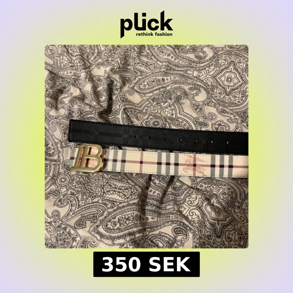 Snyggt Burberry bälte med klassiskt rutigt mönster i beige, svart och rött. Bältet har ett stilrent guldspänne med Burberrys ikoniska B-logga. Materialet är skinn och designen är både modern och tidlös, perfekt för att lyfta din outfit.