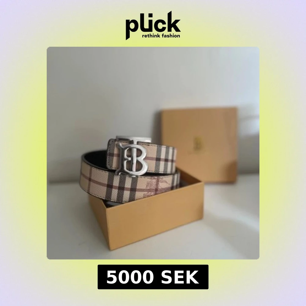 Snyggt vändbart bälte från Burberry med klassiskt rutigt mönster i beige, svart och brunt på ena sidan och svart rutigt mönster med präglad ryttare på andra sidan. Bältet har en silverfärgad metallspänne med Burberrys TB-logo. Tillverkat i skinn.