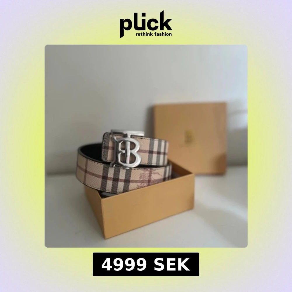 Säljer ett Burberry bälte i skinn med klassiskt rutigt mönster på ena sidan i beige, brun och svart samt svart rutigt mönster på andra sidan. Bältet har ett snyggt silverfärgat TB-spänne och Burberrys ikoniska ryttare ingraverad. Perfekt för dig som vill ha en lyxig detalj till outfiten.