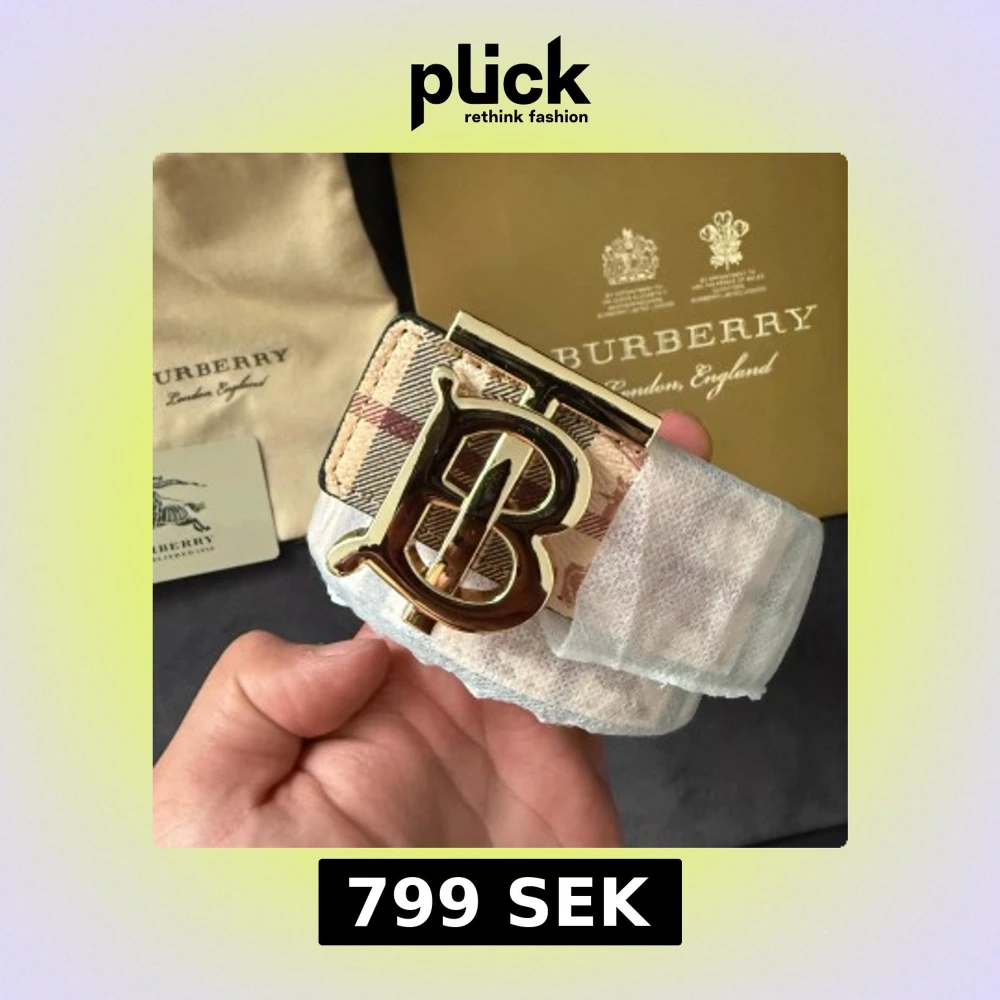 Snyggt bälte från Burberry med klassiskt rutigt mönster i beige, brunt och rött. Bältet har ett stort, glänsande guldspänne med Burberrys ikoniska B-logga. Perfekt accessoar för att lyfta din outfit med lyxig känsla.