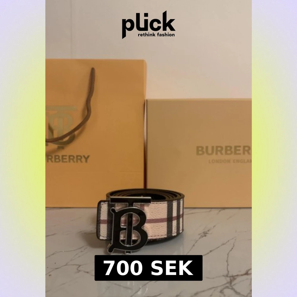 Säljer ett Burberry bälte med klassiskt randigt mönster i beige, svart och röd. Bältet har ett stort metallspänne med Burberrys ikoniska B-logga. Ena sidan är i textil med mönster, andra sidan är svart skinn med präglad rutig design och ryttare.