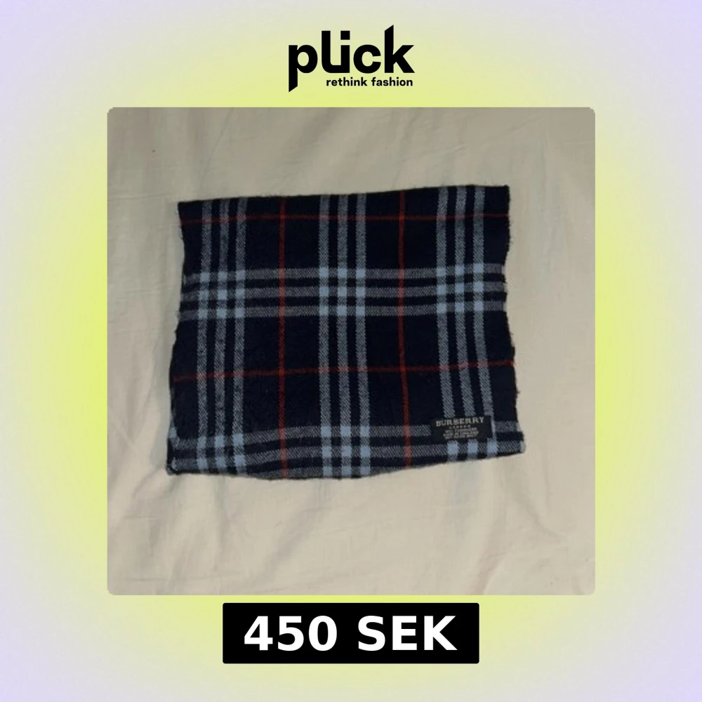 Säljer en klassisk rutig halsduk från Burberry i 100% kashmir. Halsduken har en mörkblå bas med vita och röda rutor samt fransar i ändarna. Perfekt accessoar för att lyfta din outfit.