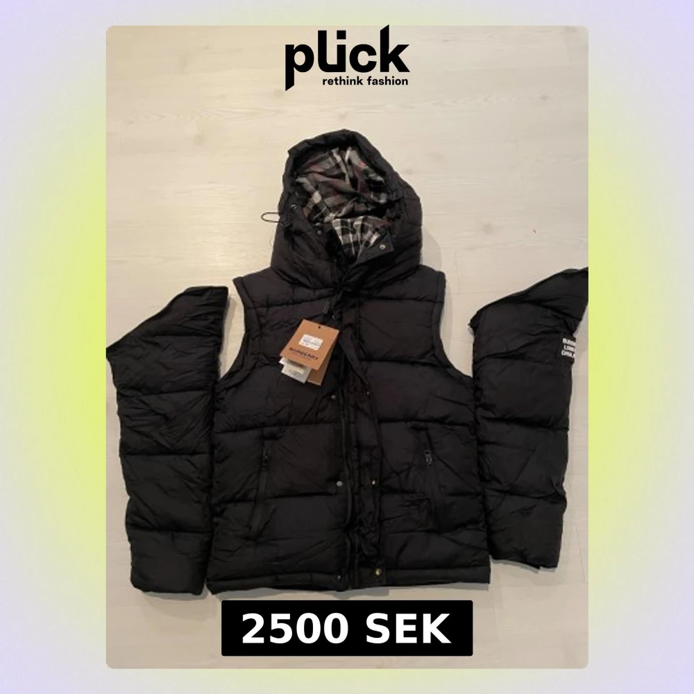Svart dunväst från Burberry med avtagbara ärmar och huva. Västen har dragkedja och knappar framtill, två fickor med dragkedja och klassiskt rutigt foder i huvan. Perfekt för kalla dagar och kan enkelt göras om till jacka. Man kan göra den till en jacka också