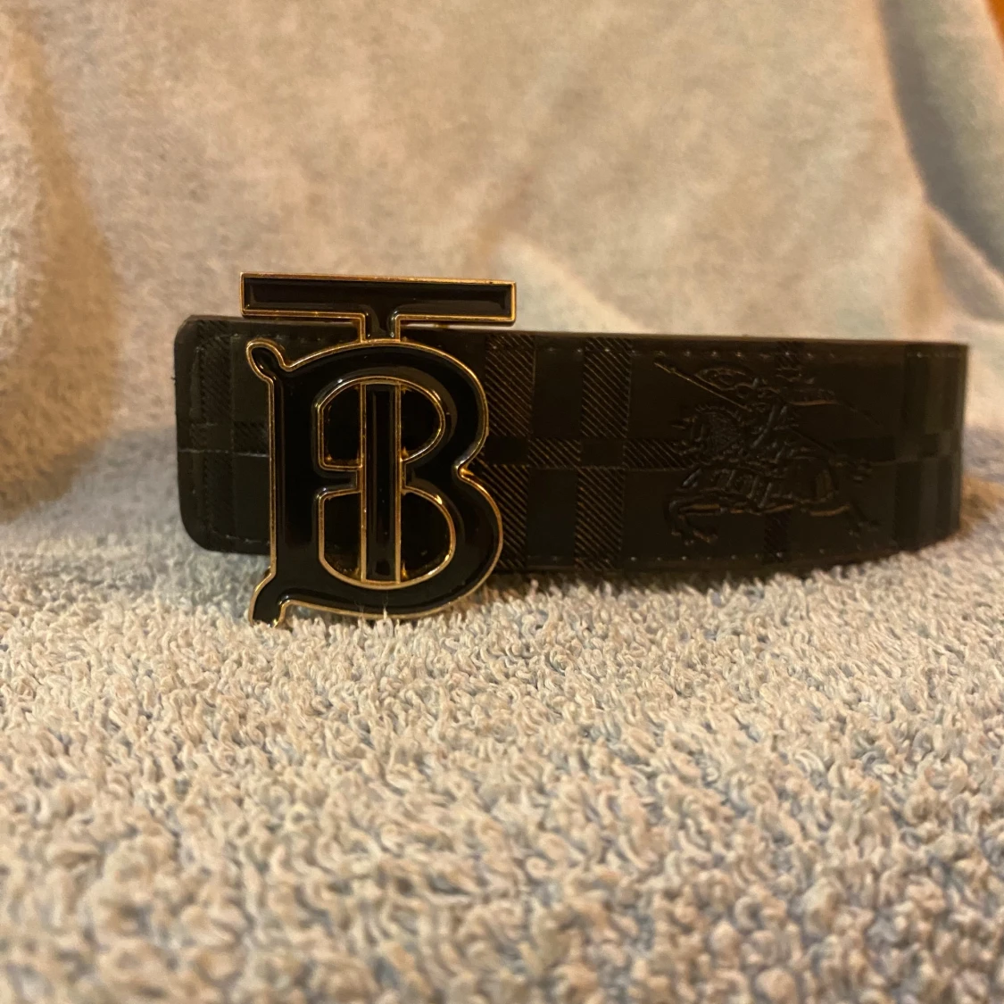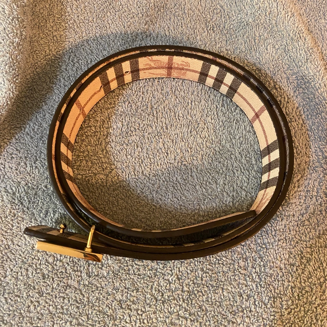 Säljer ett Burberry bälte med klassiskt rutigt mönster i beige, brun och svart. Bältet har en bred form och en stor metallspänne med Burberrys ikoniska TB-logga i svart och guld. Materialet är skinn med tryckt mönster och exklusiv känsla.