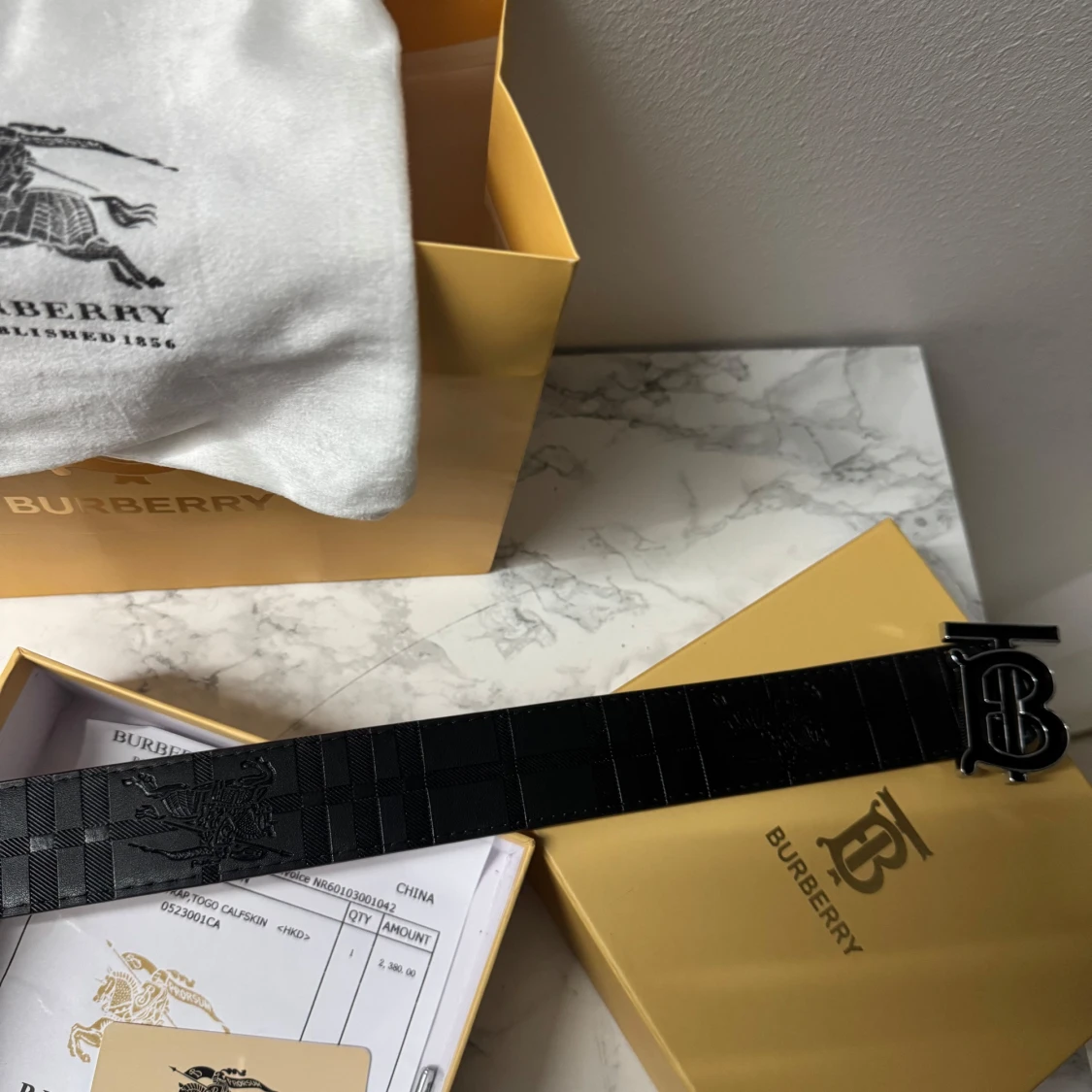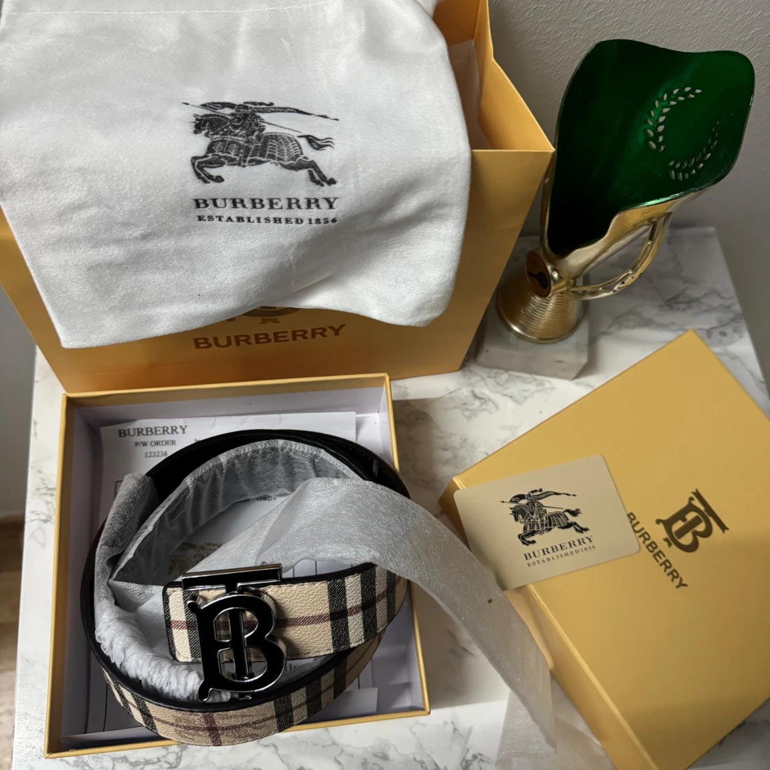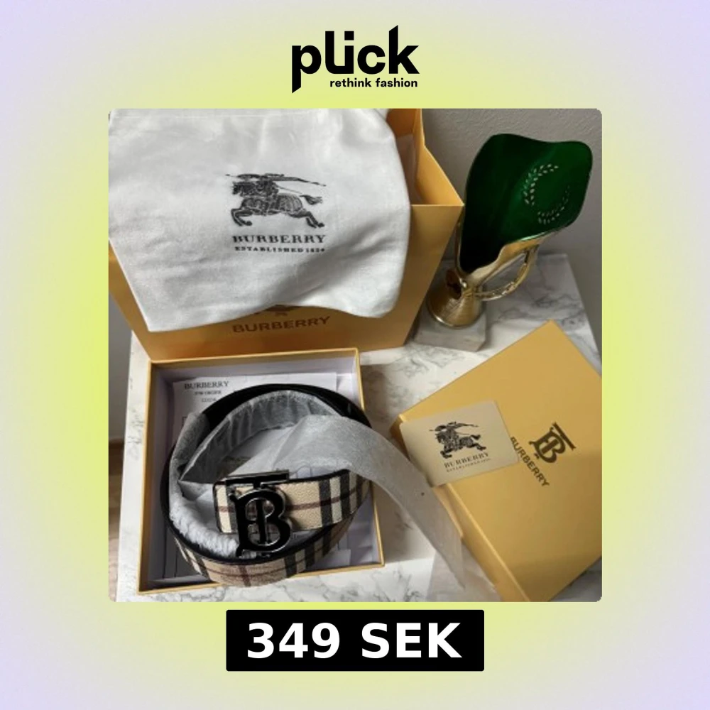 Säljer ett exklusivt Burberry bälte i skinn med ikoniskt rutmönster i beige, svart och rött samt en stilren svart variant med diskret rutig struktur. Båda har en stor metallspänne med Burberrys TB-logga. Kommer i originalförpackning med dustbag och certifikat.