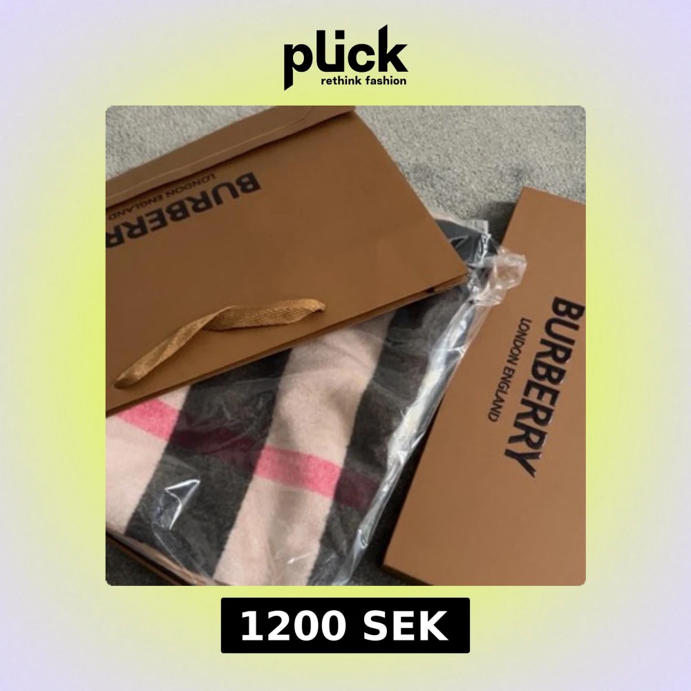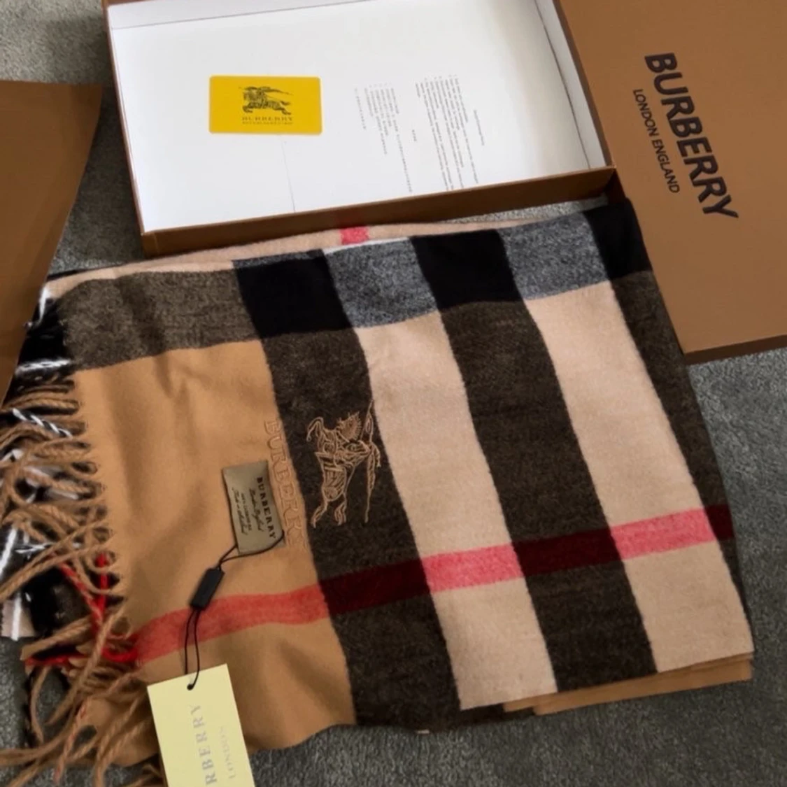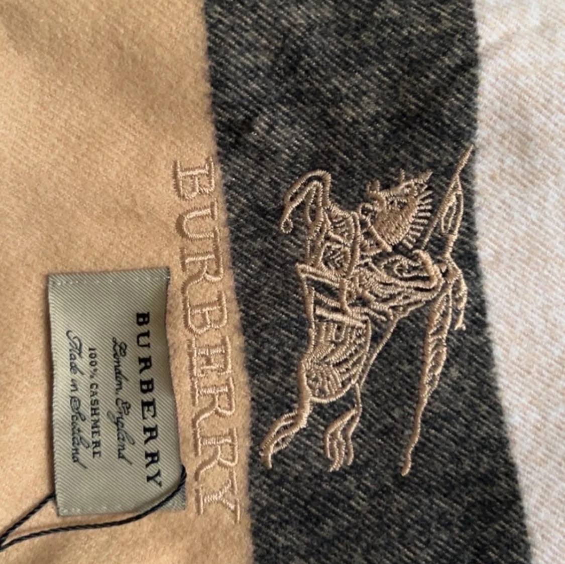 Exklusiv halsduk från Burberry i 100% kashmir med klassiskt rutigt mönster i beige, svart, grått och rött. Broderad Burberry-logga och ryttare på ena sidan. Mjukt material och fransar i ändarna. Kommer med originalförpackning och taggar.